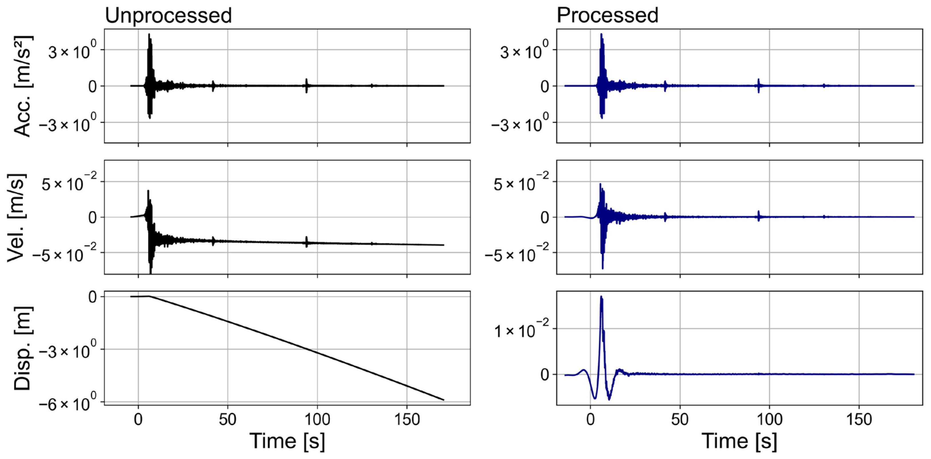 - Instrument Response Correction: For KMA records, the instrument response correction is performed by first retrieving the station-specific response file (RESP) from the NECIS. If the RESP file is unavailable, alternative response files provided by previous studies [11,12] are used to convert raw counts into physical quantities (i.e., acceleration or velocity time histories).