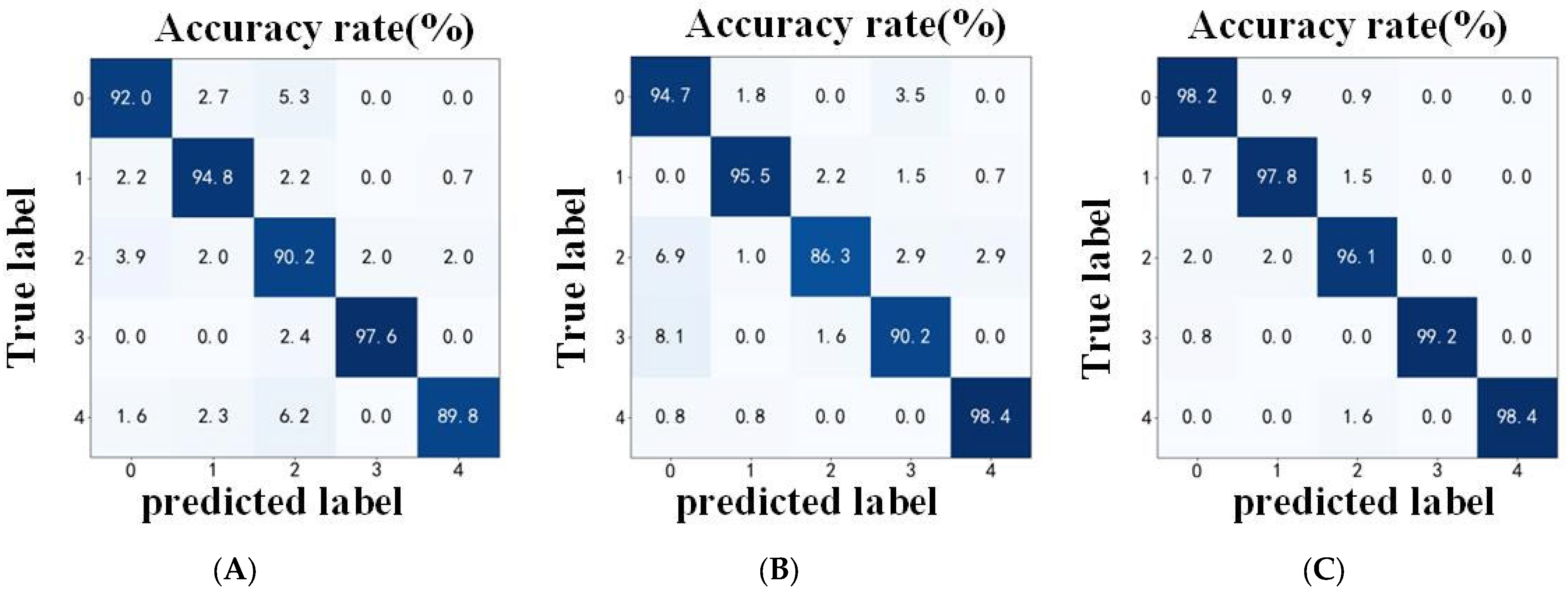 In the confusion matrices for each channel method, along the x-axis, the fault recognition accuracy for labels 2 and 4—namely tooth damage and tooth loss conditions—stands at 90.2% and 89.8%, respectively, both below the overall accuracy of 91.03%. This indicates that x-channel data presents greater recognition challenges for these two categories. Along the y-axis, faults labelled 2 and 3—tooth defects and tooth fractures—fell below the overall average accuracy of 92.04%. However, accuracy for label 4 (tooth missing) reached 98.4%, significantly outperforming x-axis data. Thus, despite minimal difference in overall average accuracy, each channel’s data clearly exhibits distinct advantages for different faults.