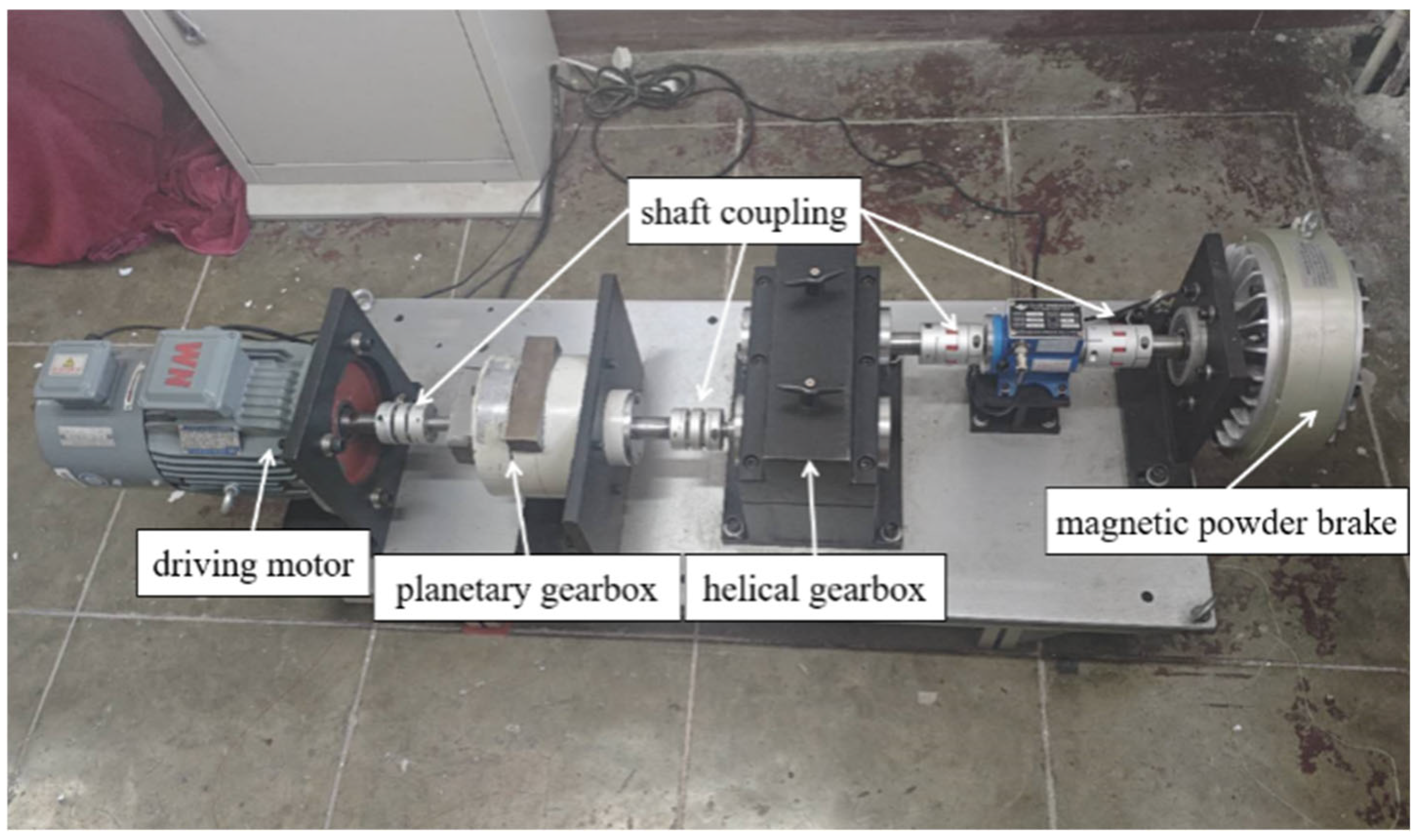 The test bench primarily consists of a variable-speed drive motor, multiple couplings, a planetary gearbox, a helical gearbox, and a magnetic powder brake. Its structure is illustrated in