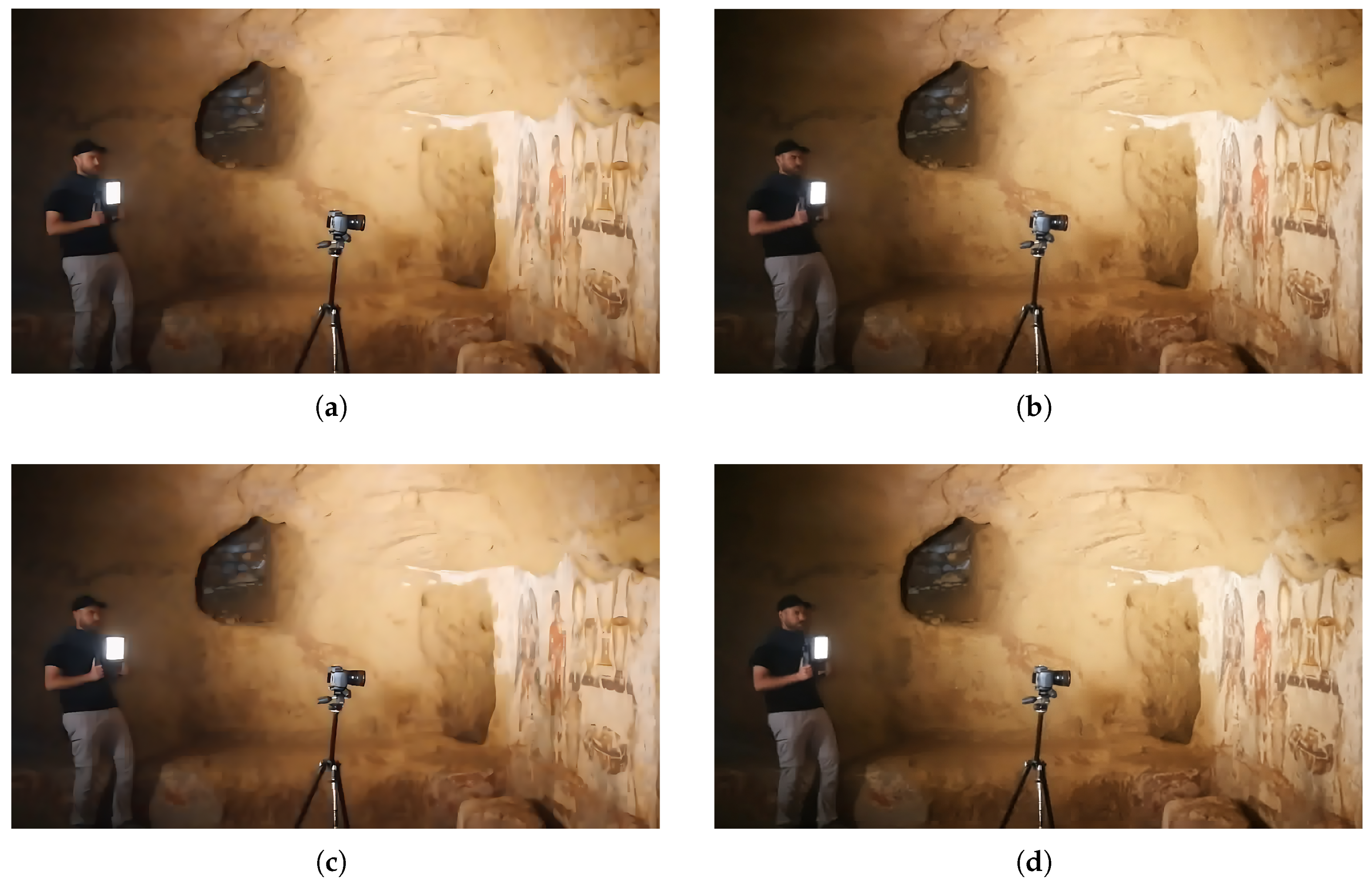 - Light painting:Inside the Etruscan tomb, uneven illumination was the main obstacle. The space is highly articulated, narrow corridors, central pillars, and static LED panels produced hard cast shadows and strong fall-off. Adding more lamps did not solve the problem in tight passages. Similar conditions and solutions are reported in the literature, where teams alternate between flashlights in extremely narrow spaces and light-painting for totally dark environments; multi-flash arrays are discussed but often deemed impractical when space and operators are limited [15]. Other colleagues also note vignetting and hotspot issues with on-camera or speedlight solutions, favoring light-painting to obtain uniform illumination for SfM [34]. More recently, “Chiaroscuro Photogrammetry” systematizes long-exposure imaging with a small, handheld LED moved across the scene, so that illumination is averaged over time while preserving the local contrast typical of a point source. This approach has documented advantages over flash, improving surface continuity and texture legibility [14].In our case, we faced the same spatial and logistical constraints noted by these authors and therefore avoided flash systems altogether. We adopted a light-painting strategy consistent with this body of work. Light painting is a long-exposure photographic technique in which a light source is moved through the scene during the exposure [35]. The adopted workflow was the following: the camera was mounted on a tripod and operated in full manual mode with constant parameters for SfM (ISO 100–200, aperture f/8–f/16, multi-second exposures), fixed white balance and remote triggering. For each image, an operator slowly “painted” the scene with one or two handheld LED lights, sweeping across walls, ceiling, floor, and around pillars (Figure 5); the continuous motion averaged light directionality, reducing cast shadows and fall-off while minimizing flare and hotspots. We maintained 70–80% overlap along corridors and around pillars, added obliques to strengthen geometry, placed coded targets where permitted, and verified histograms on site to avoid clipping. This workflow, inspired by above-mentioned practices, produced images with uniform illumination and textures well suited to tie-point extraction and dense matching in these confined, complex interiors (Figure 6).