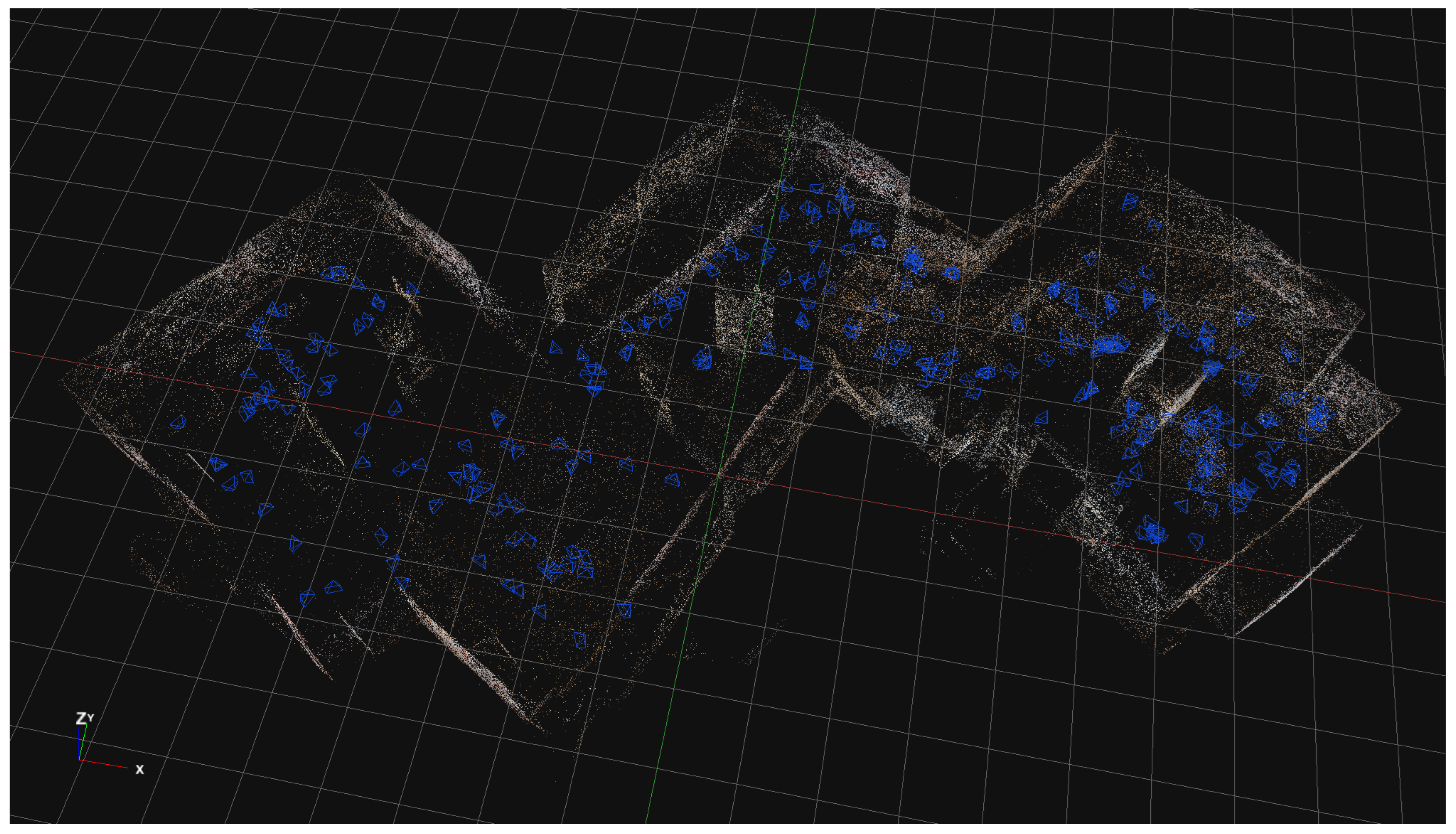 - Laser Scanning:For the architectural documentation of the visible remains, 21 laser scans were acquired using a Faro Focus 3D S150 (Lake Mary, FL, USA), a phase-shift laser scanner. Each scan was performed with a resolution of one point every 6 mm within a 10-m radius. This configuration allowed for an optimal balance between acquisition time and the geometric resolution of the archaeological structures. Spherical calibration targets were placed on site to facilitate scans registration during post-processing activities. The distribution of these targets was planned to ensure significant overlap areas between individual scans and to guarantee that at least 3 spheres were visible from every scan position. The 21 scans were carried out from multiple positions, with careful planning of TLS placement to minimise shadowed areas.