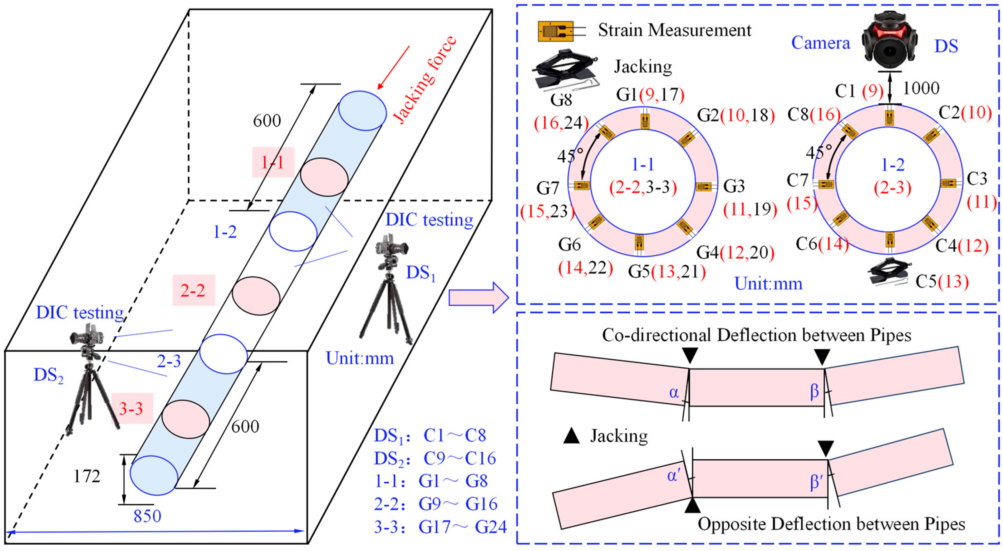 - Liu, K.; Chen, X.; Zhang, P.; Ma, B.; Feng, X.; Zhang, Y.; Liu, H.; Tan, X.; Xu, T. Axial mechanical response of concrete pipe jacking considering the deflection of the bell-and-spigot joint: Full-scale test and numerical simulation. Tunn. Undergr. Space Technol. 2024, 149, 105805. [Google Scholar] [CrossRef]
