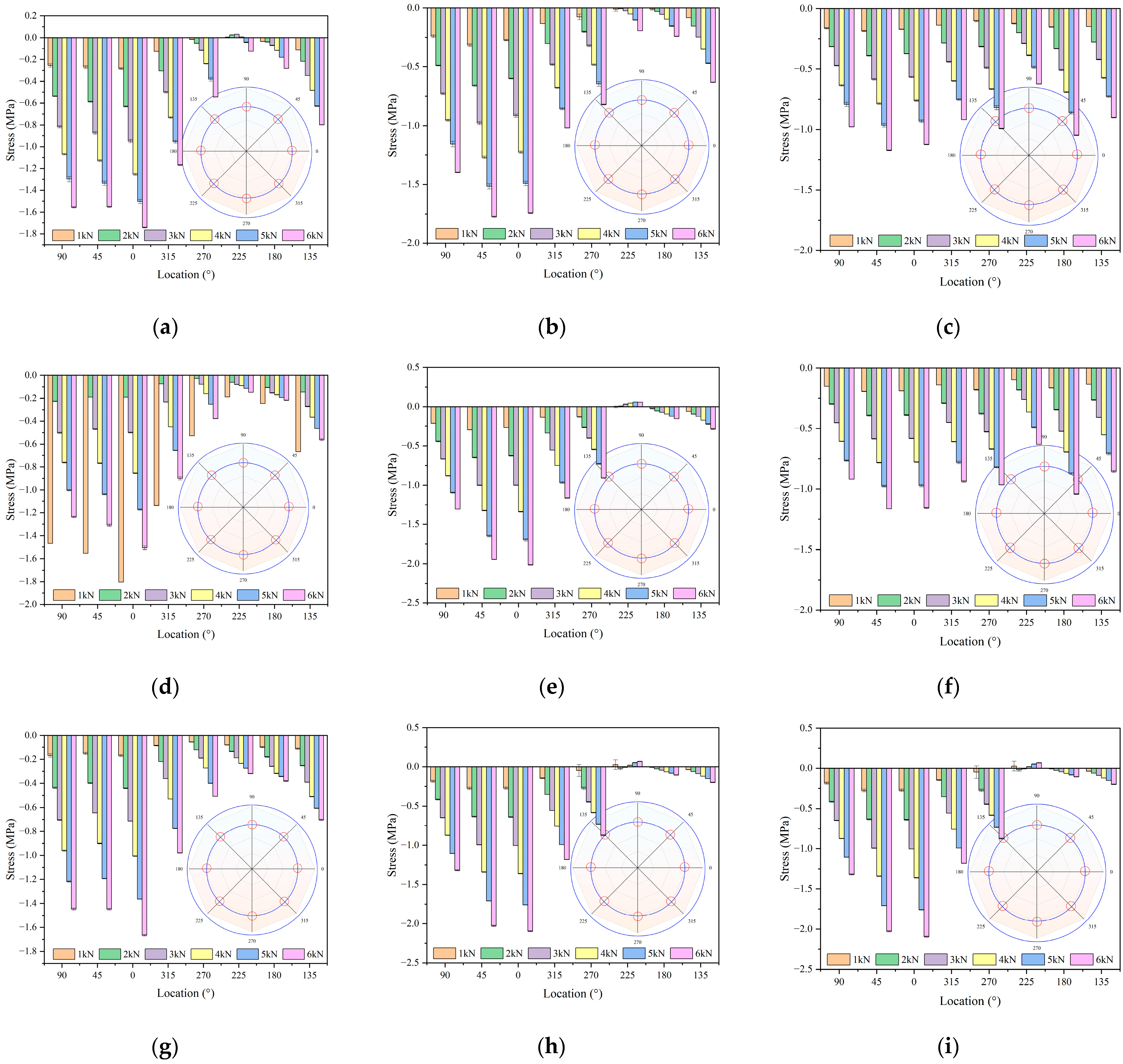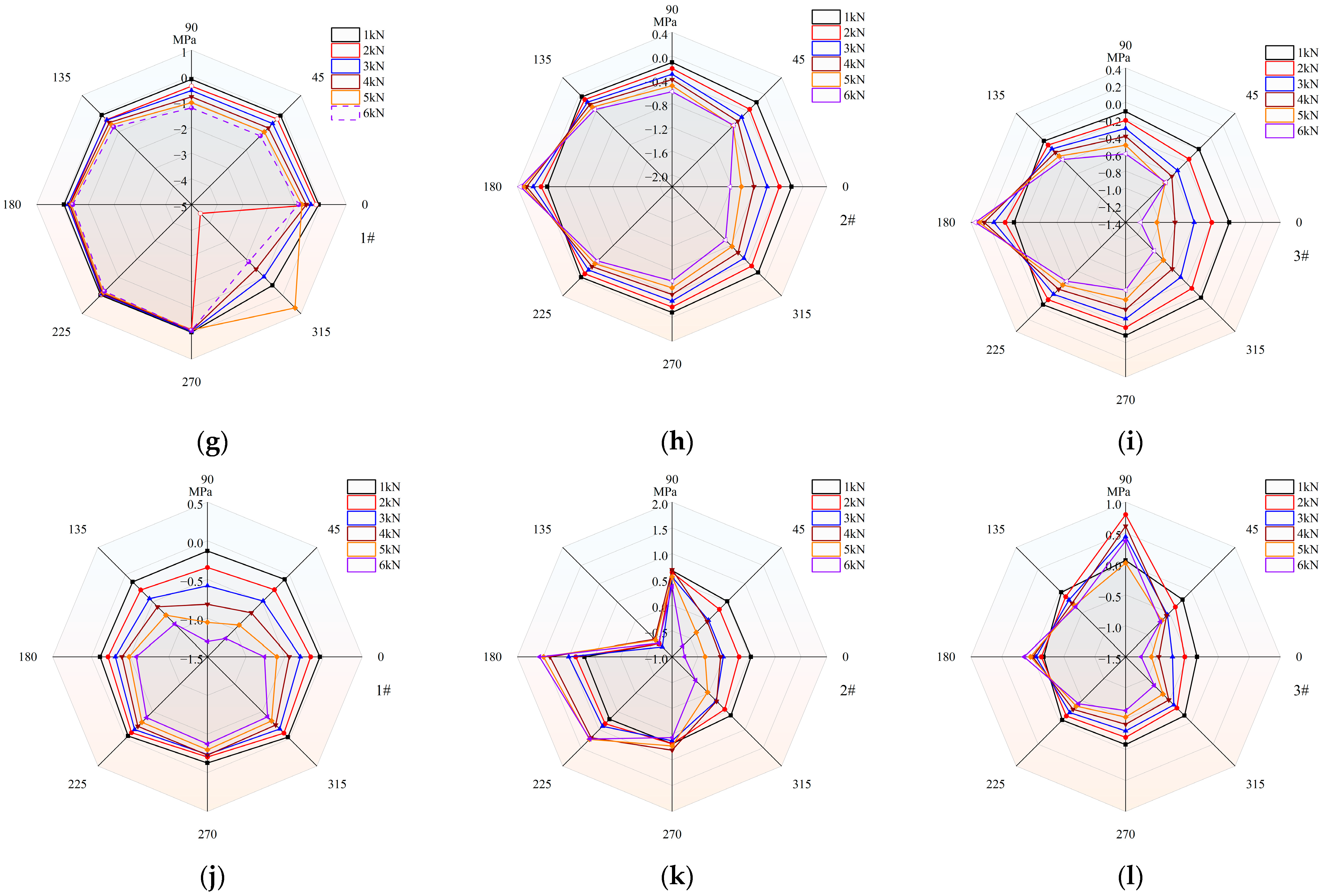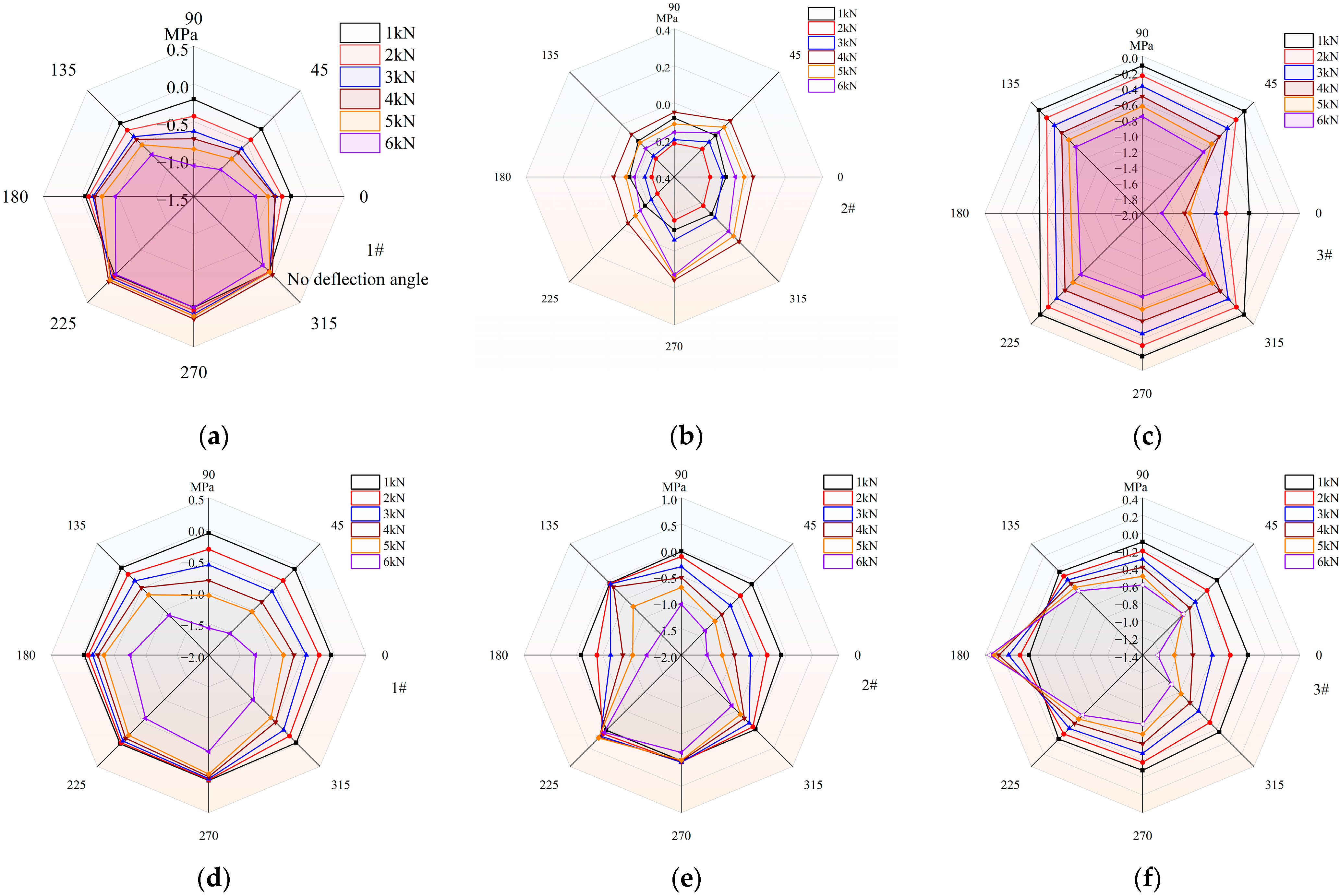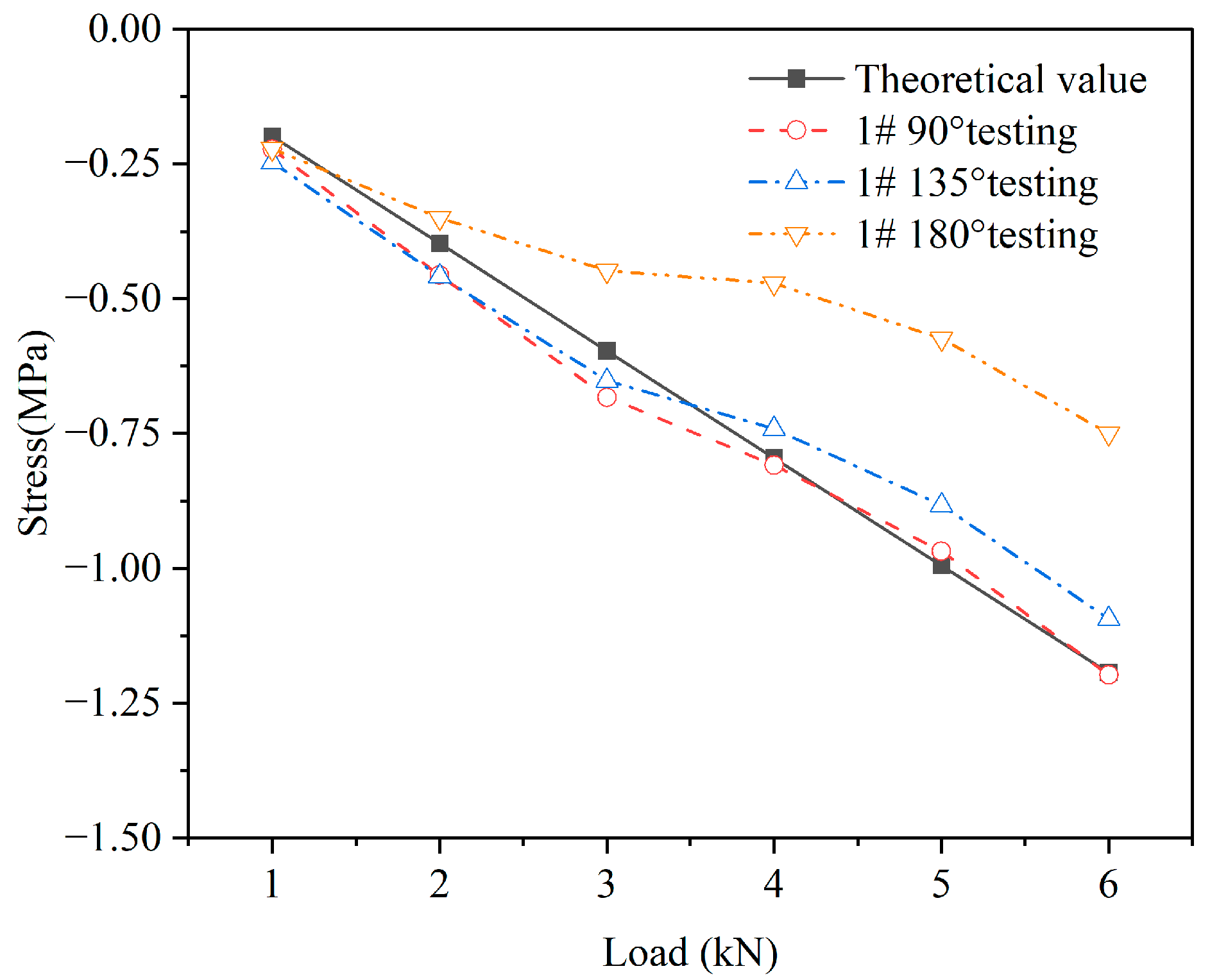 | Load /kN | Theoretical Values/MPa | 1# 90°Testing/MPa | 1# 135°Testing/MPa | 1# 180°Testing/MPa |