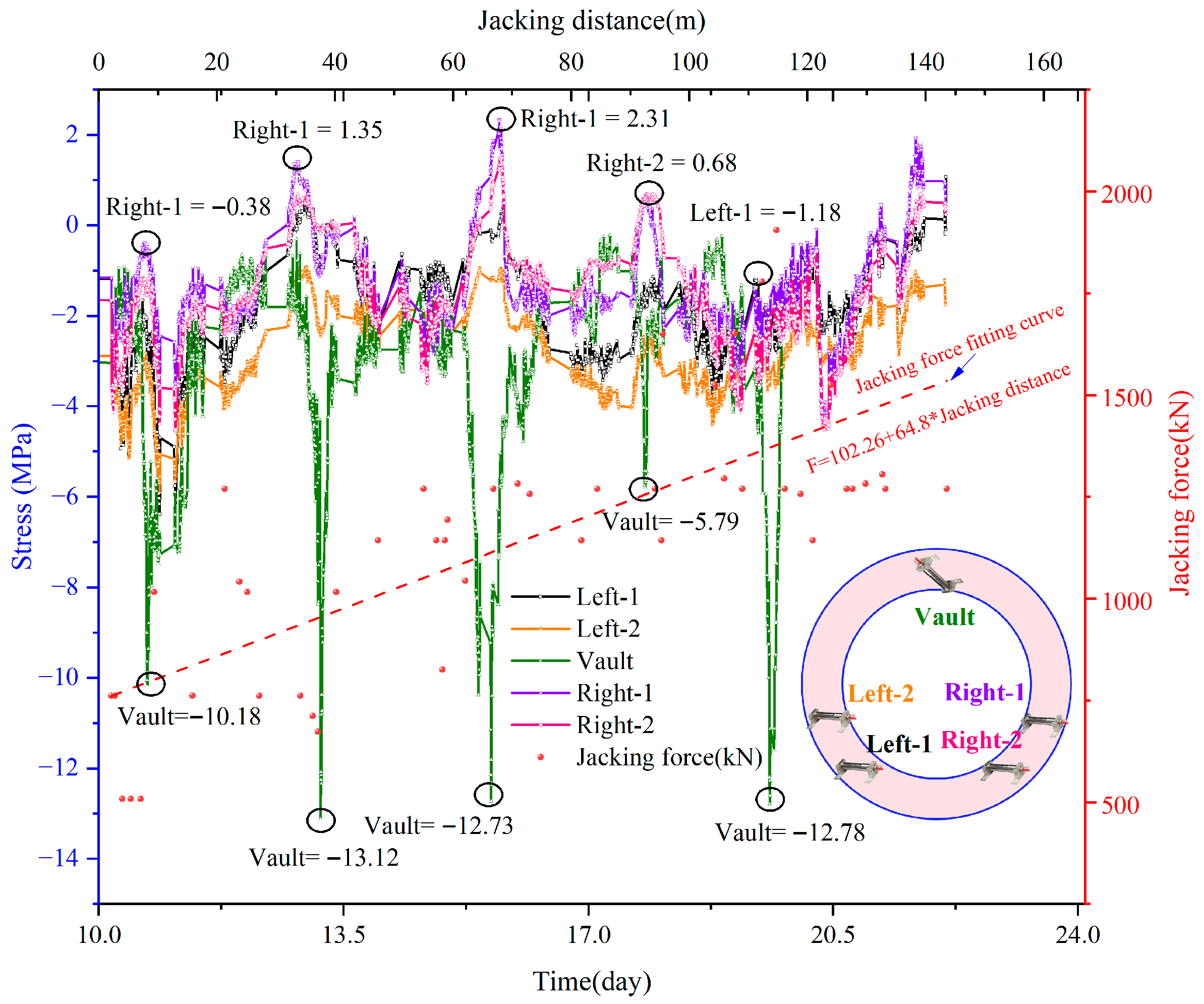 - Zheng, S.; Wang, C.; Luo, Z.; Zhang, Y.; Chen, J.; Li, X. Factors Influencing Pipe Stress Responses in Pipe Jacking in Bedrock: Field Monitoring and Numerical Simulation. J. Pipeline Sci. Eng. 2025; 100320, in press. [Google Scholar] [CrossRef]