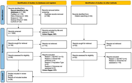 A total of 1186 records were identified through search strategies in electronic databases; additionally, 32 records were retrieved through secondary search. After the removal of 186 duplicate records, 1000 studies were evaluated. Of these, 944 were excluded after reading titles and abstracts (Cohen’s Kappa index = 94%). Fifty-six documents were selected for full-text evaluation. Ten of these could not be retrieved. Among the 46 studies evaluated, 22 were excluded for the following reasons: they were not randomized clinical trials (n = 13), they were study protocols (n = 4), they did not include the target population (n = 2), or they did not evaluate pre-established outcomes (n = 3). The inter-rater agreement rate in this phase was 91%. In parallel, 32 additional records obtained by complementary methods were evaluated. Of these, 10 were not retrieved, and 20 were excluded after full-text evaluation: four were not randomized clinical trials and 16 did not report the outcomes of interest. In total, 26 studies met the inclusion criteria and were incorporated into the qualitative and quantitative synthesis. The detailed process of identification, selection, and exclusion of studies is presented in Figure 1.