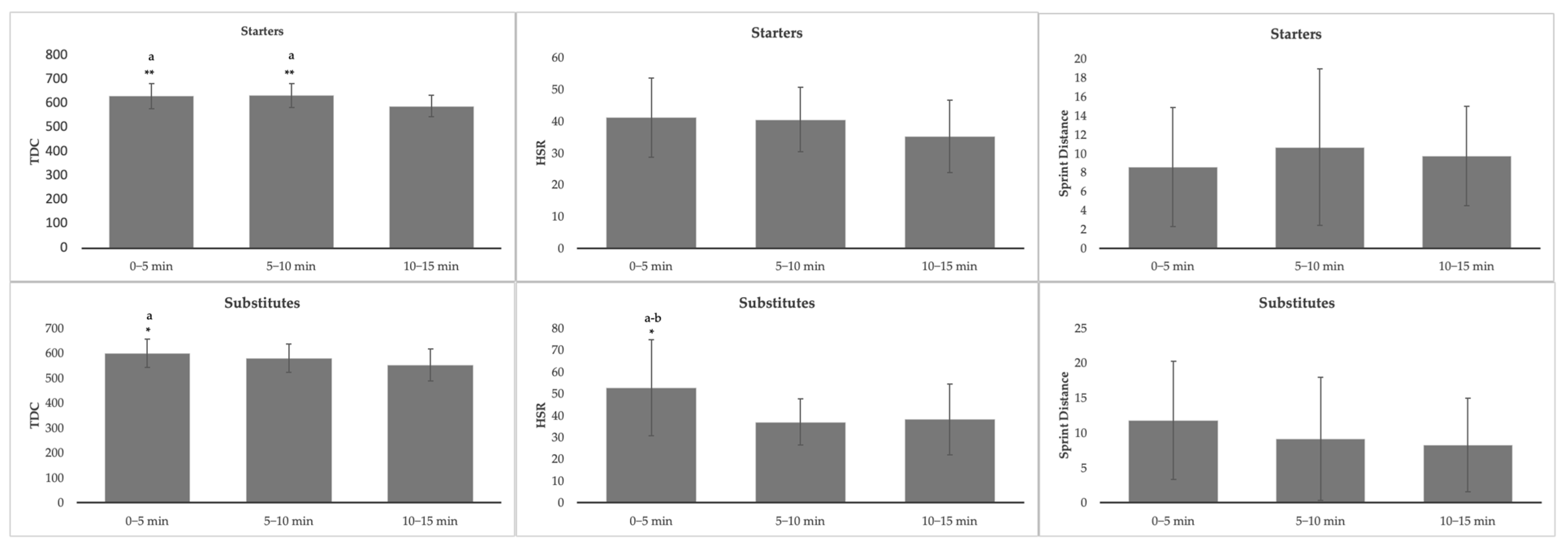 3.3. Formatting Comparison of Progression Across Three 5-Min Periods in Starters and Substitutes