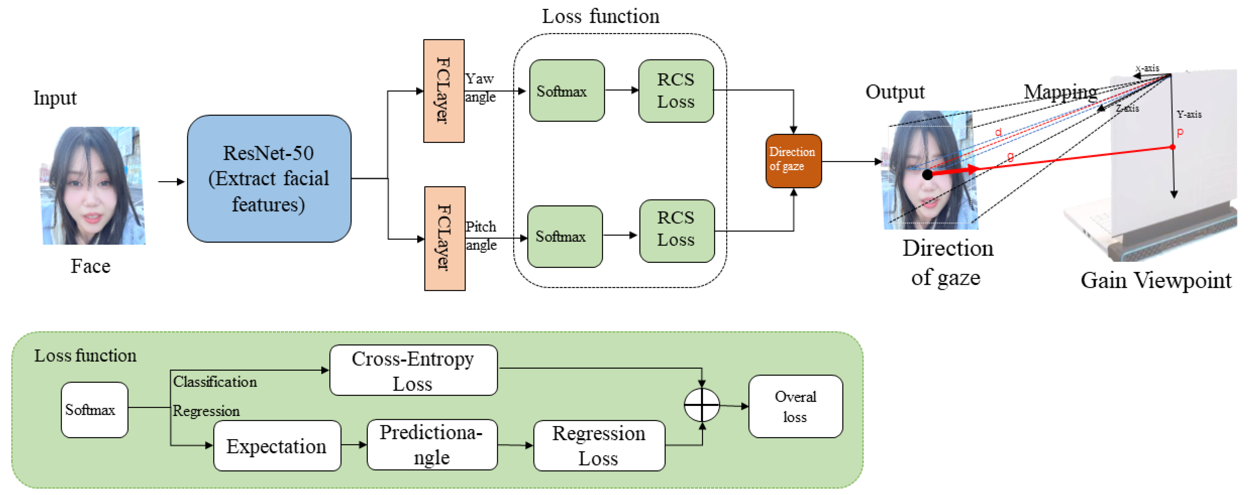 To achieve multi-task learning, the gaze pixel coordinates are discretized into classification units: at 1920 × 1080 resolution, the horizontal direction is divided into 69 intervals and the vertical direction into 39 intervals. The model achieves collaborative learning by jointly optimizing classification and regression losses: logit values from the fully connected layer undergo softmax transformation to generate classification probability distributions, while smooth L1 loss handles the regression task. This multi-objective loss strategy integrates cross-entropy classification loss with smooth L1 regression loss, constructing an end-to-end framework that significantly enhances model robustness and training stability.