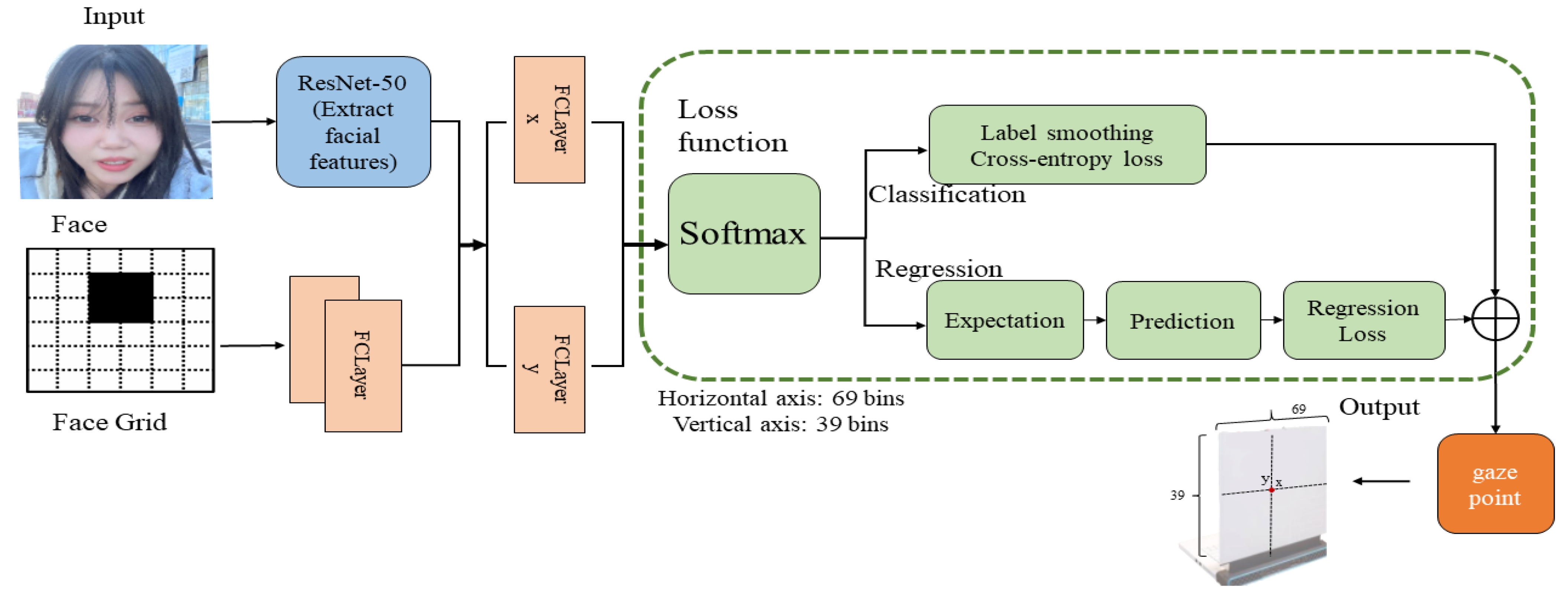 To address these issues, this paper proposes a method that uses facial images containing gaze information and a facial grid representing the face’s relative position on the screen as input, simplifying the complex structure required to obtain the gaze point. This approach employs independent fully connected layers to regress x and y coordinates separately, enabling more precise extraction of relevant features in both directions. We propose a classification-based eye-point localization method that divides the screen into 69 × 39 regions for coarse eye-point category estimation, thereby reducing computational cost. Two independent loss functions (each containing classification and regression components) predict eye-point positions, effectively enhancing model stability.