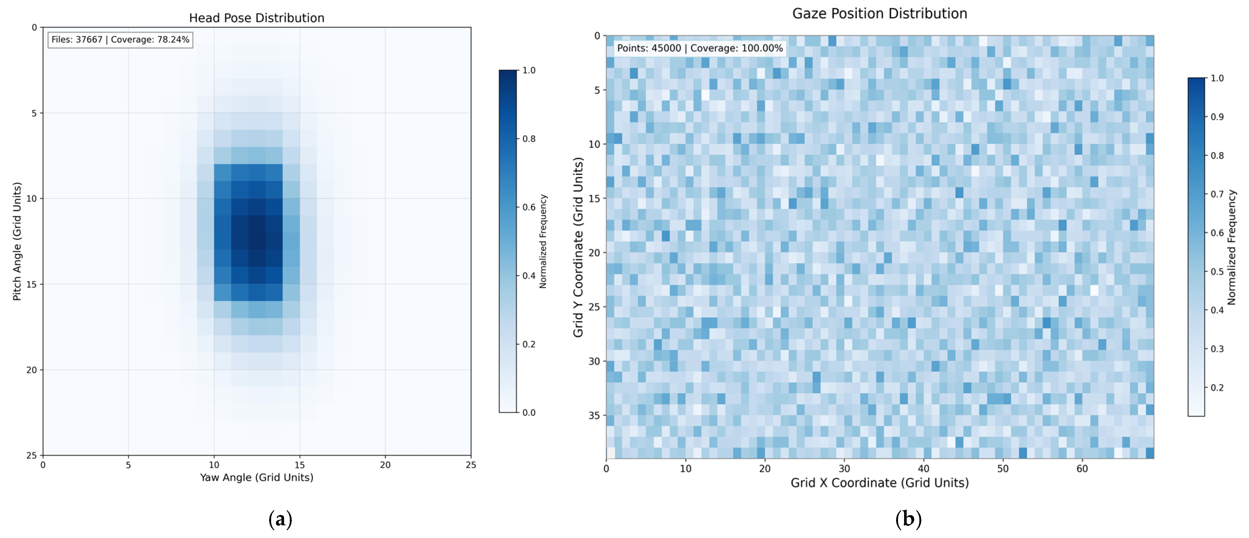 Figure 4: 100% screen view coverage and 78.24% head pose coverage. However, when eye tracking was interrupted due to blinking, prolonged eye closure, head pose exceeding tracking range, temporary failure of facial feature recognition, or occlusion of the face/eyes by hands, hair, or objects, the annotation system recorded default values (0,0) as placeholders. This occurred in 2564 samples, accounting for 12% of the dataset.