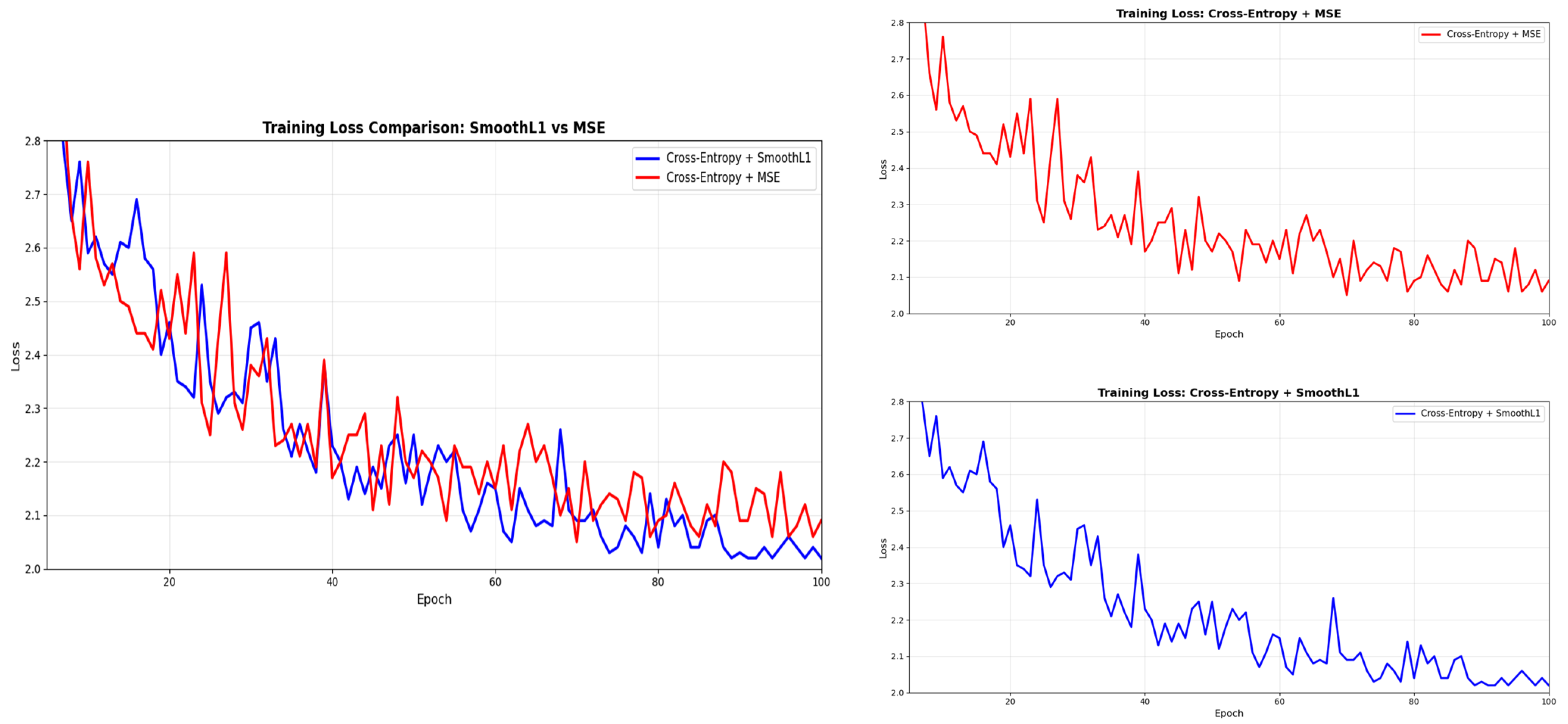 Experimental results demonstrate that the combination of Cross-Entropy and SmoothL1 loss functions exhibits superior convergence characteristics during training. Compared to the Cross-Entropy + MSE combination, Cross-Entropy + SmoothL1 achieved a lower final loss value of 2.02 cm after 100 training cycles while displaying a smoother and more stable convergence trajectory. The Cross-Entropy + MSE combination exhibited significant numerical fluctuations during the early training phase. This is attributed to the quadratic penalty characteristic of the MSE loss function for outliers, while the piecewise linear nature of the SmoothL1 loss function effectively mitigated gradient explosion issues. Thus, this result demonstrates that the SmoothL1 loss function selected in this paper reduces abrupt changes in model outputs, ensuring consistent predictions between adjacent frames. Consequently, it enables stable and smooth convergence for data featuring extreme head rotations and lighting conditions, enhancing the model’s robustness.