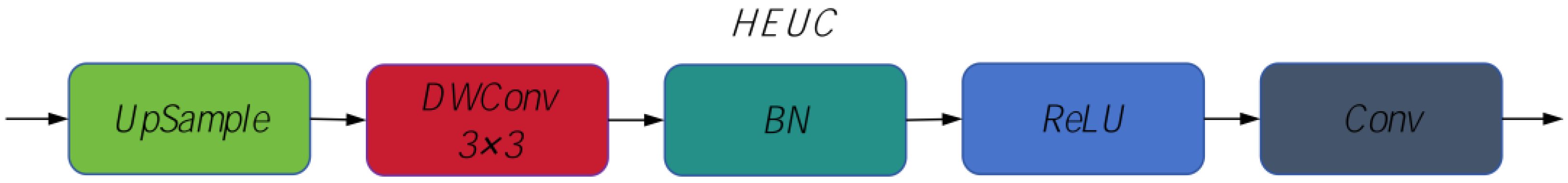 High-Efficiency Up-Convolution (HEUC) module: Accurate cross-scale feature fusion is critical for precise localization and classification. HEUC combines efficient upsampling with depthwise separable convolutions [