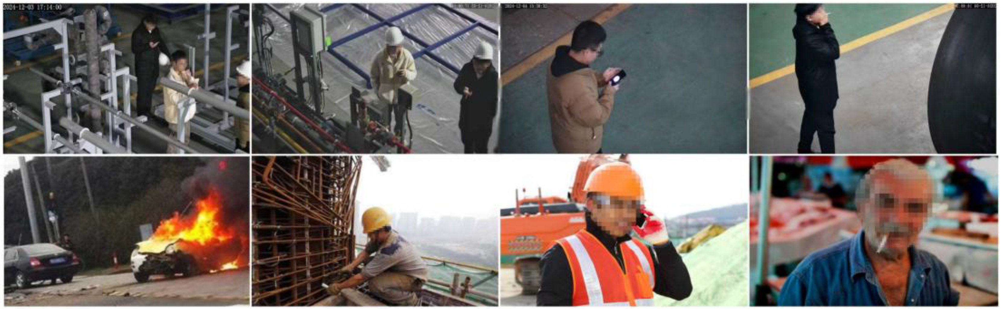 4], including protective equipment usage, hazardous behaviors such as smoking or mobile phone use, and emergency events such as fire and smoke. However, deploying real-time detection systems in industrial environments presents several challenges [