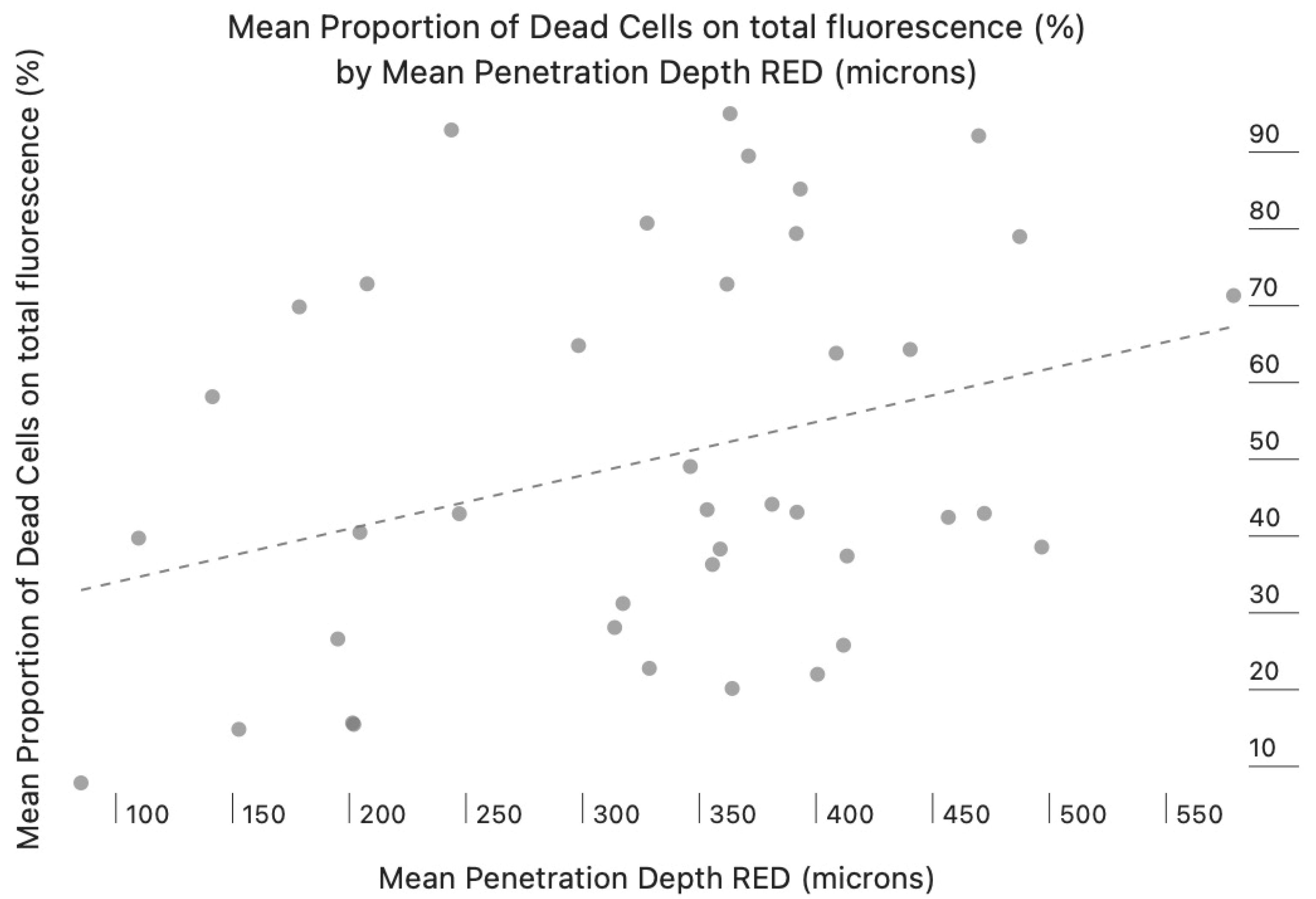 | Groups | Mean Depth of Action (µm) | Mean Proportion of Dead Cells Volume (Red Fluorescence Ratio) |