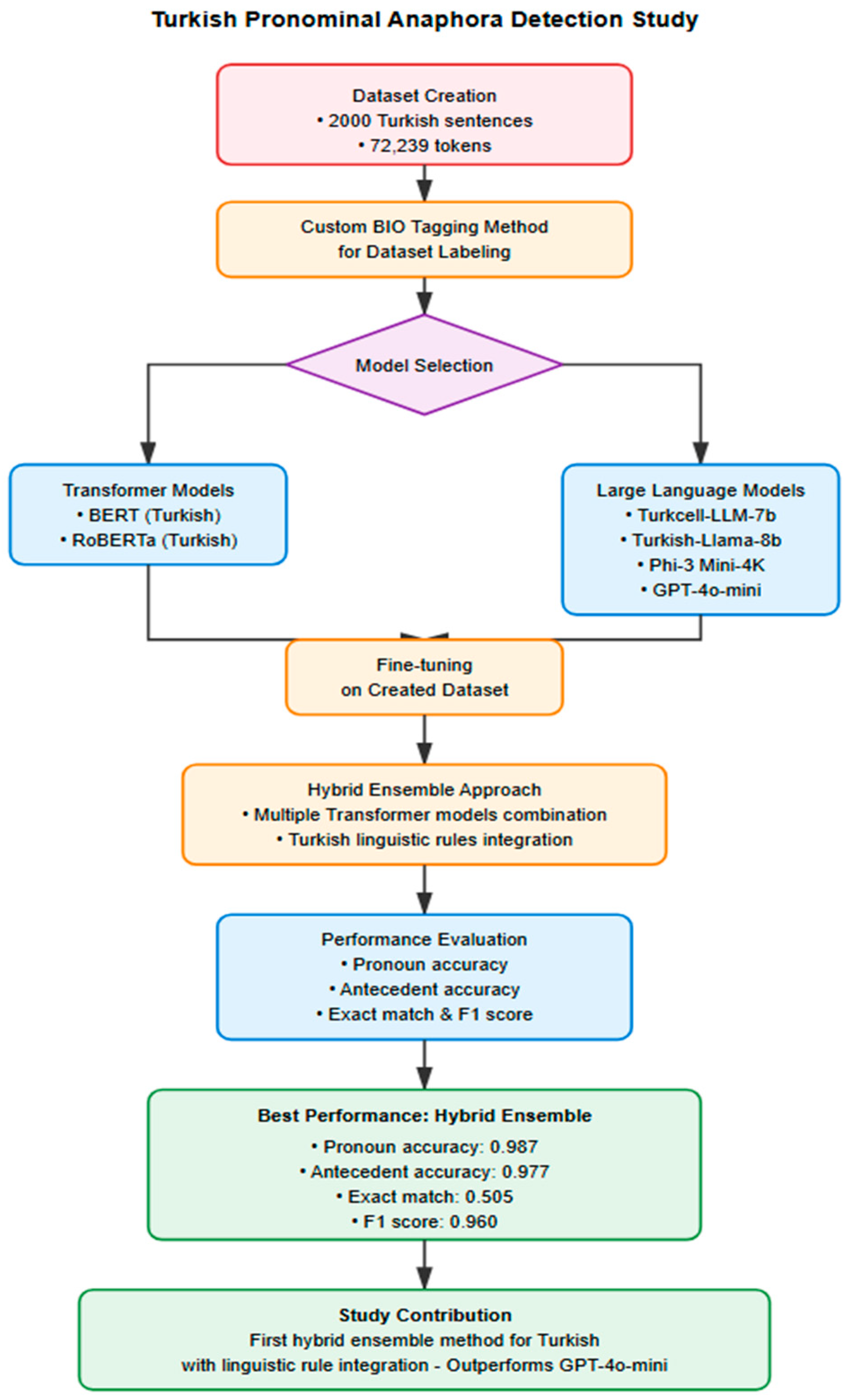 The most significant contribution of this research is the development and validation of a hybrid ensemble approach that achieves state-of-the-art performance in Turkish pronominal anaphora resolution. By combining Turkish BERT and DeBERTa-v3 architectures with linguistic rule integration, the system achieved a pronoun accuracy of 0.987, an antecedent accuracy of 0.977, and an F1-score of 0.960, surpassing all individual models, including advanced LLMs like GPT-4o-mini.