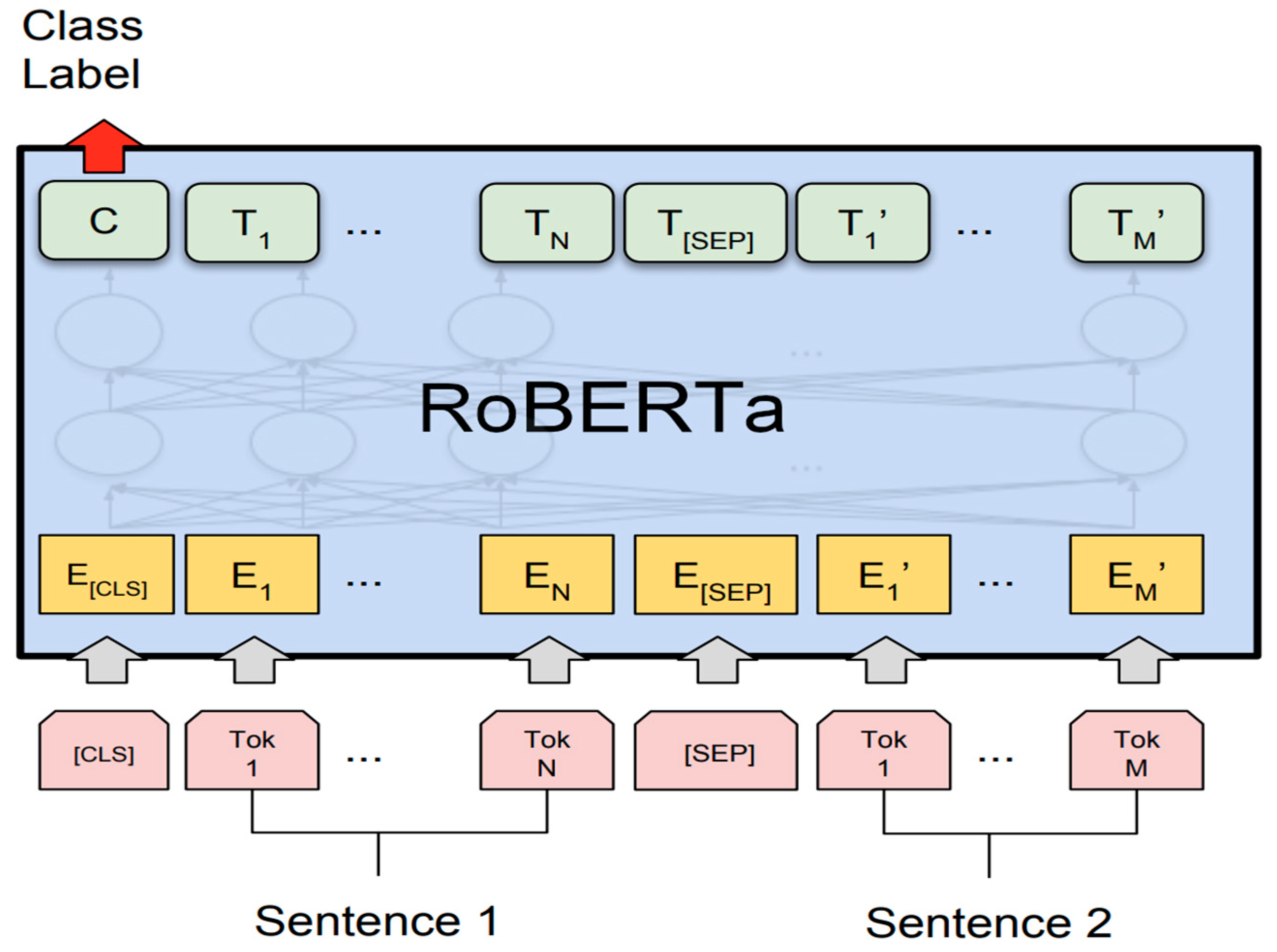 RoBERTa is trained solely with the Masked Language Modeling (MLM) objective and a dynamic masking technique; that is, different words are masked in each training epoch, enhancing the model’s contextual generalization ability. The Next Sentence Prediction (NSP) sub-task used in BERT has been completely removed. This allows the model to avoid unnecessary task complexity while focusing on learning context.