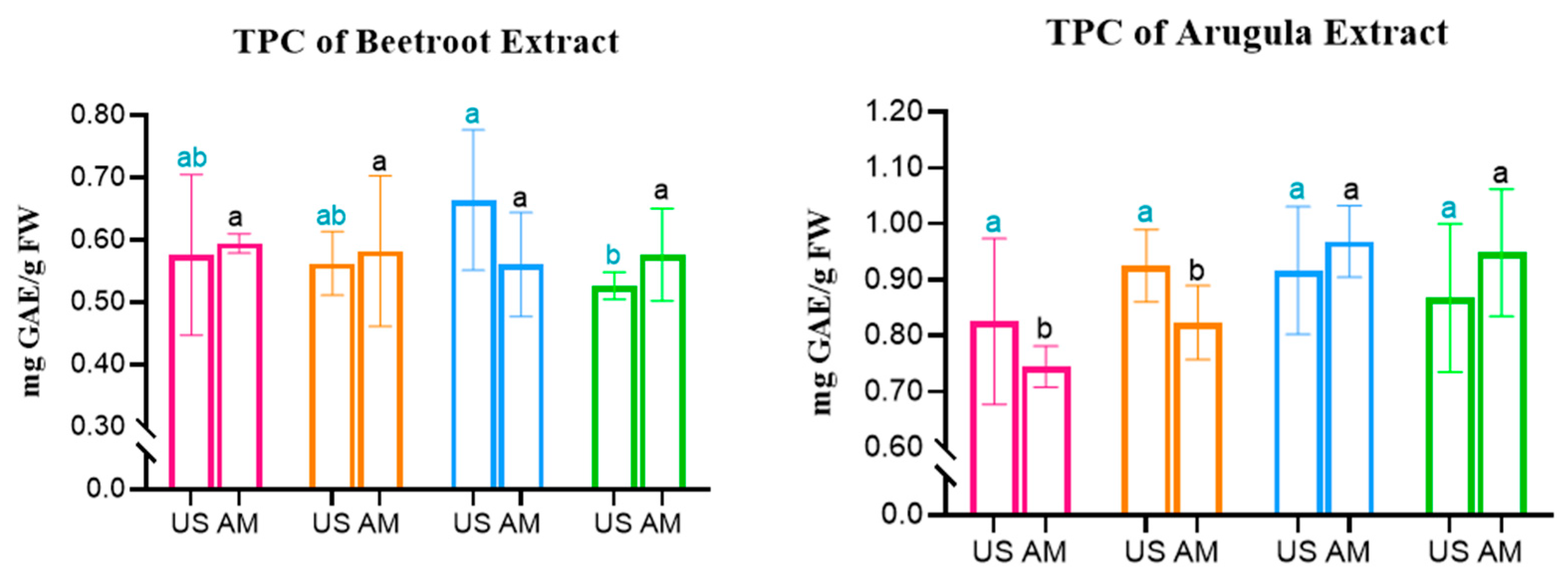 | Arugula | DPPH | US | % inhibition | 70.19 ab ± 4.15 | 68.37 ab ± 5.48 | 62.96 b ± 8.38 | 73.19 a ± 6.83 | 0.015 | 0.275 |
