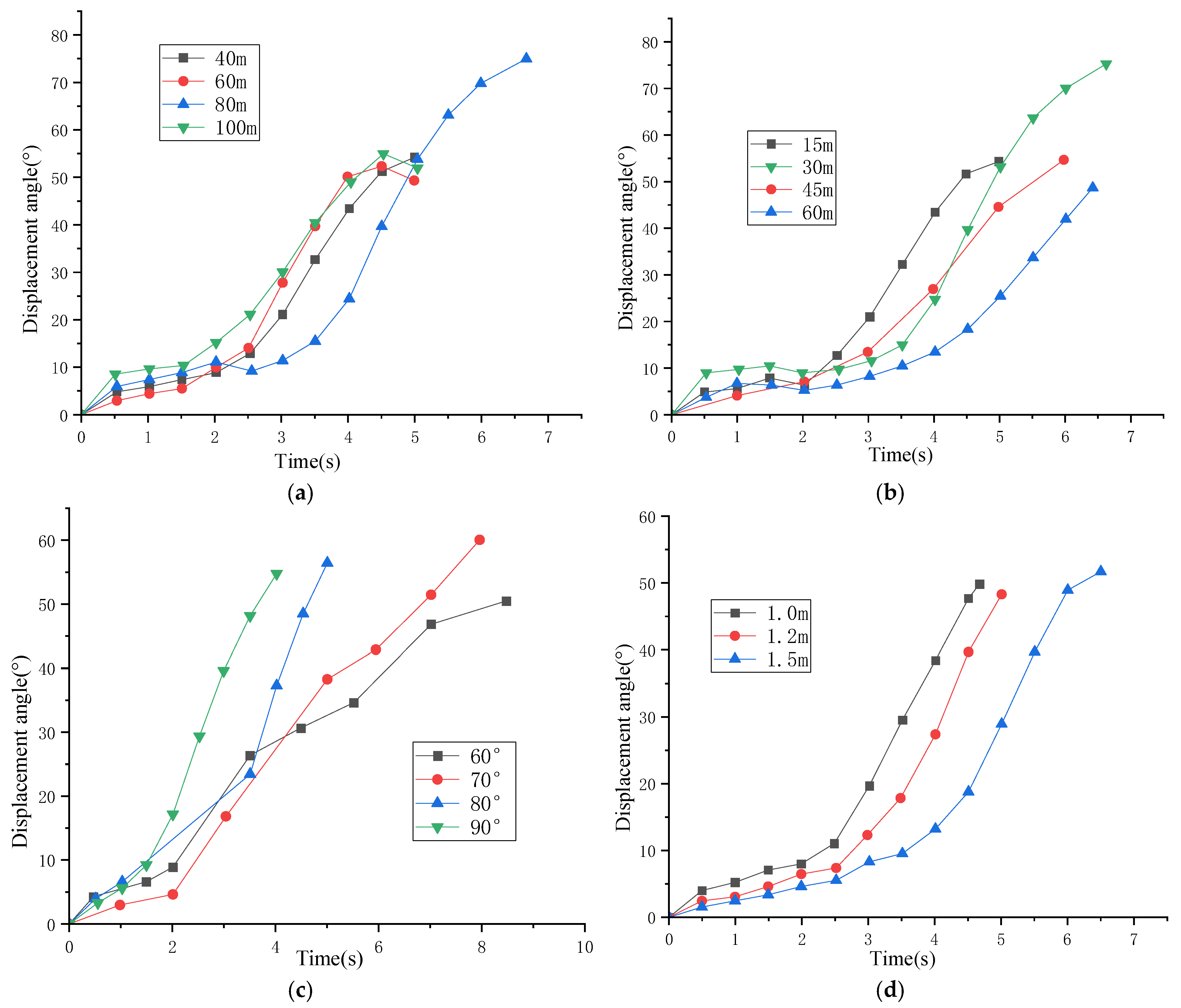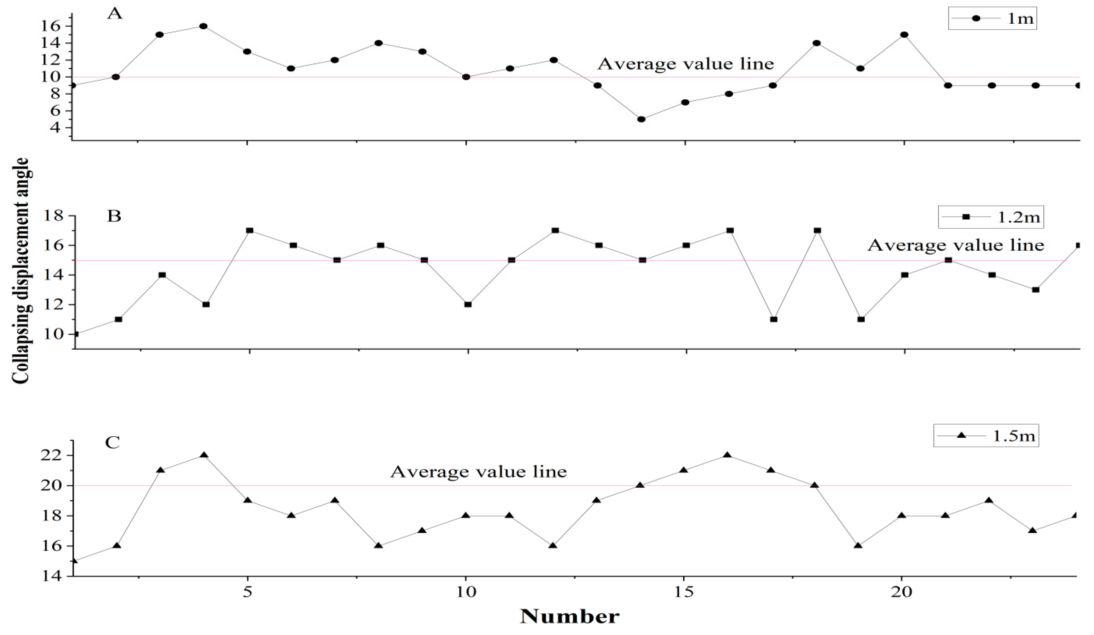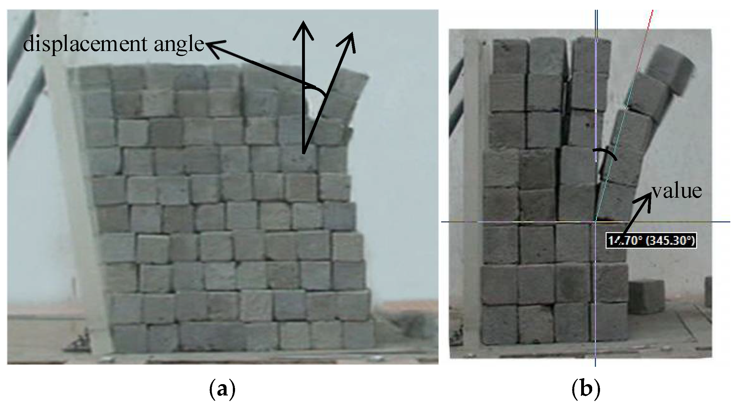 - Collapse displacement angle is strongly correlated with joint spacing. Quantitative result: The collapse displacement angle ranged from 9 to 15°, 12 to 17°, and 16 to 21° for joint spacings of 1.0 m, 1.2 m, and 1.5 m, respectively. Interpretation: Larger joint spacing (i.e., lower fragmentation) increases the critical angle required for collapse initiation. Engineering implication: The displacement angle serves as a quantifiable precursor for early-warning systems; monitoring tilt beyond these thresholds can signal imminent collapse.