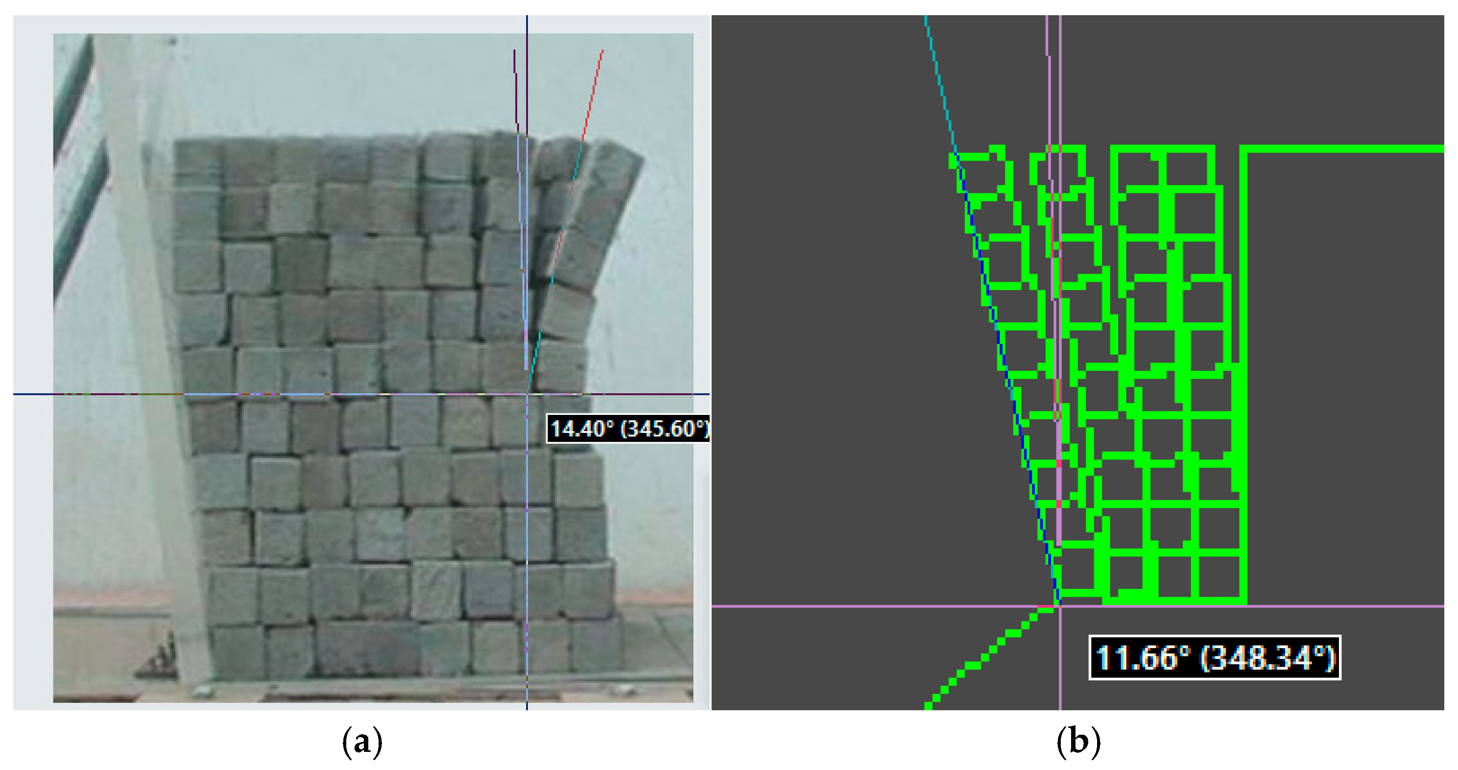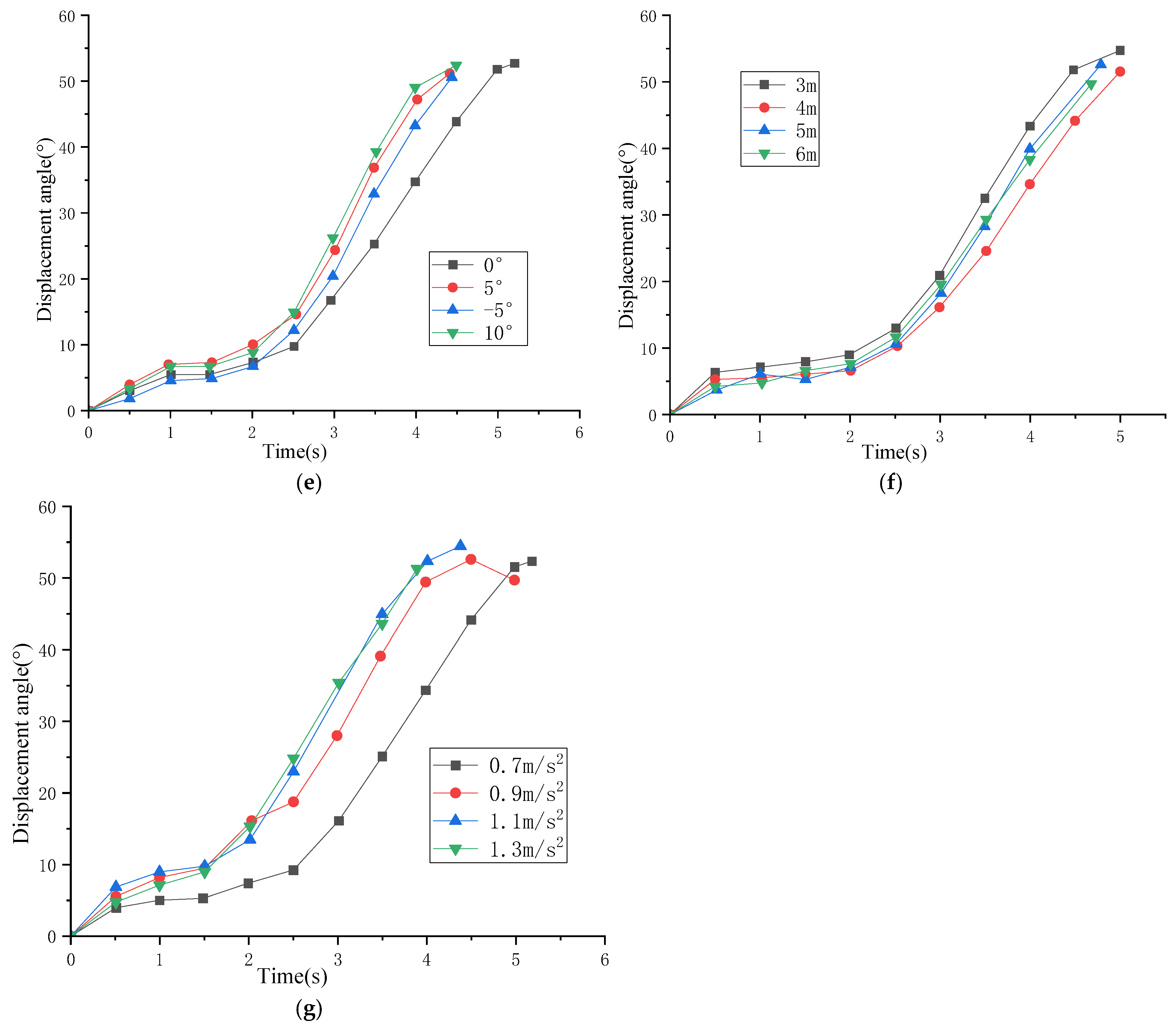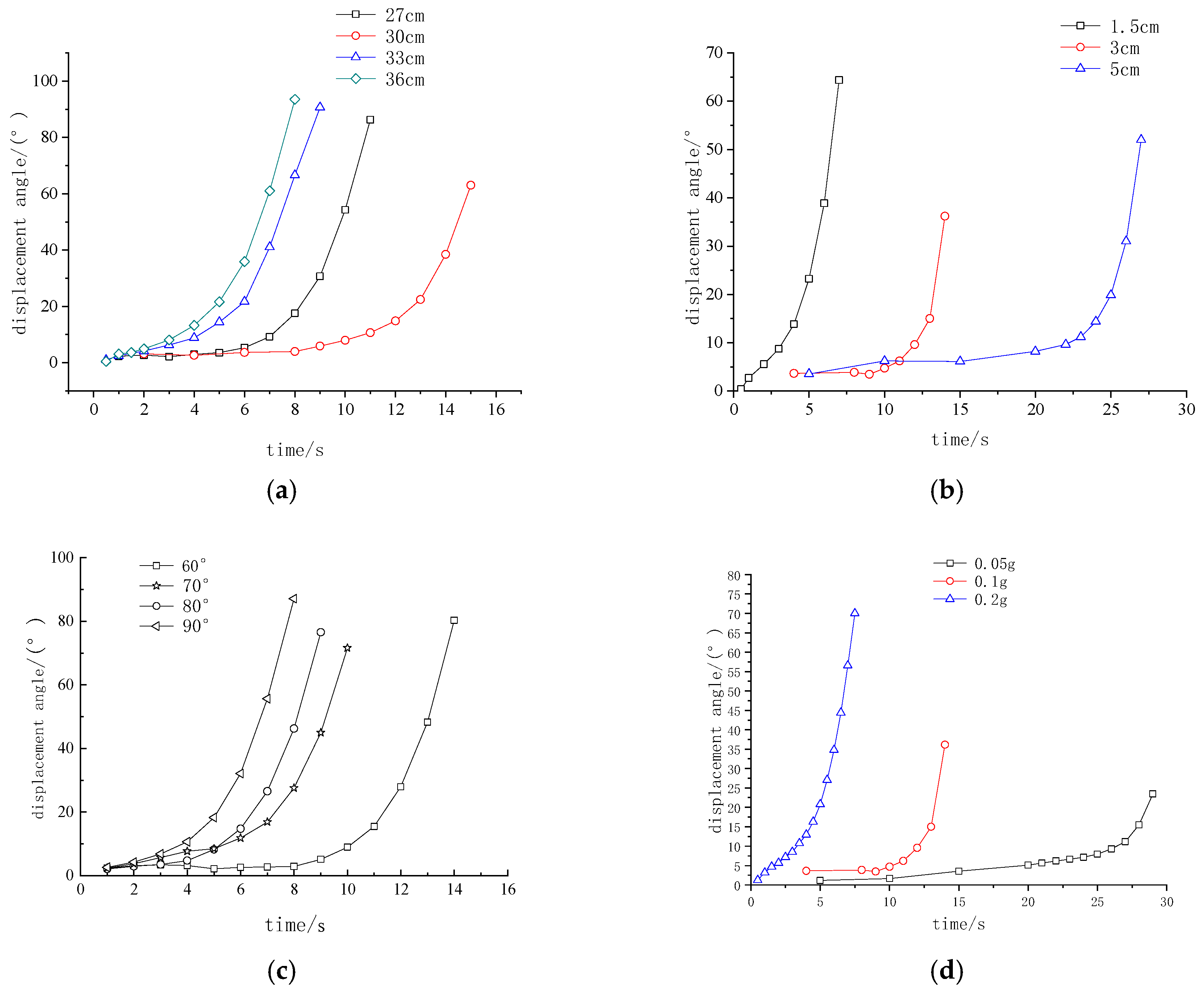 - Collapse displacement angle is strongly correlated with joint spacing. Quantitative result: The collapse displacement angle ranged from 9 to 15°, 12 to 17°, and 16 to 21° for joint spacings of 1.0 m, 1.2 m, and 1.5 m, respectively. Interpretation: Larger joint spacing (i.e., lower fragmentation) increases the critical angle required for collapse initiation. Engineering implication: The displacement angle serves as a quantifiable precursor for early-warning systems; monitoring tilt beyond these thresholds can signal imminent collapse.
