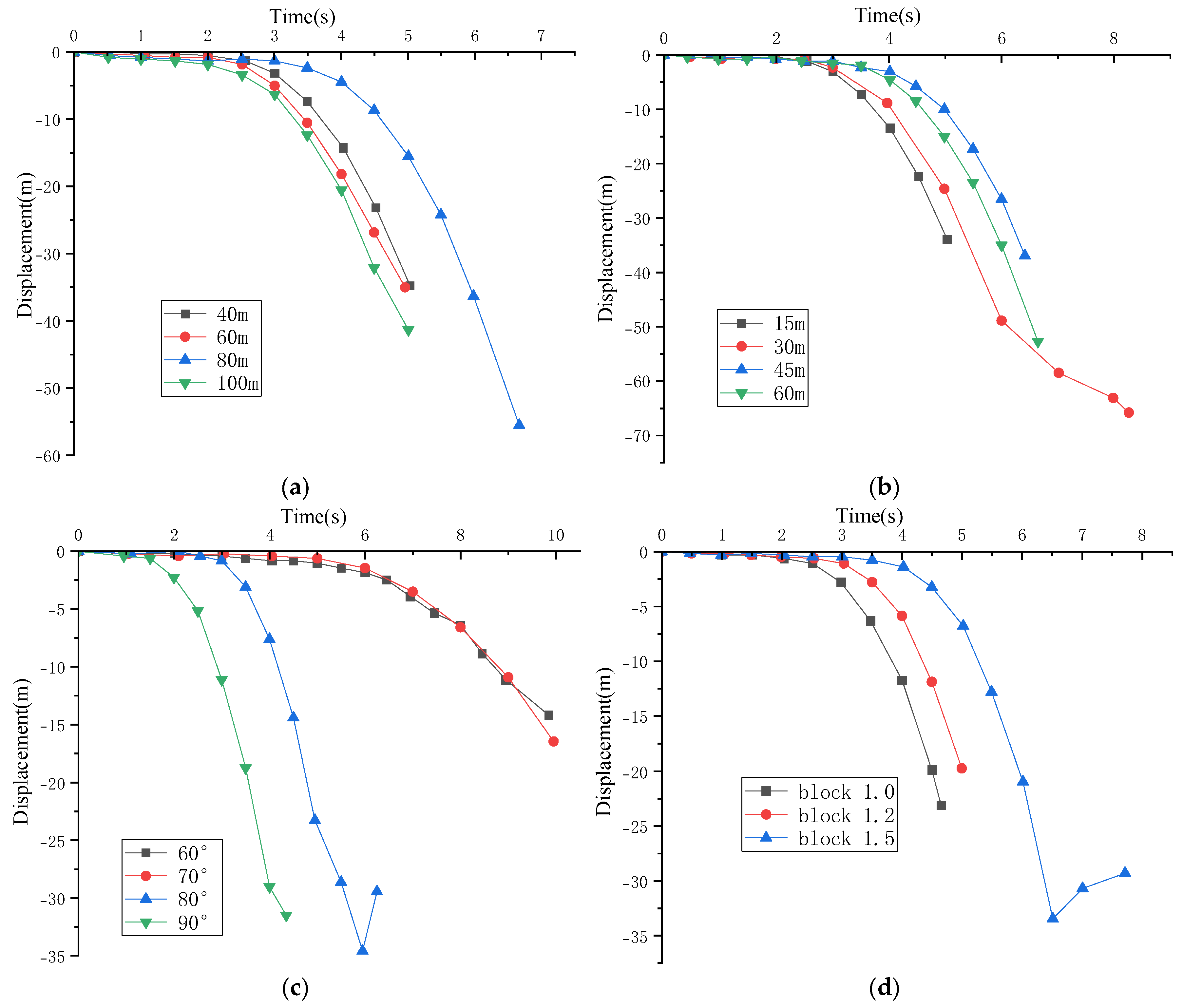 | Block Height | H2 | H2 < 45 m: The upper section above the inflection point experiences integral toppling failure, while the lower section undergoes secondary collapse. H2 > 45 m: The failure pattern exhibits two inflection points, resulting in an S-shaped collapse trajectory. | Yes |
