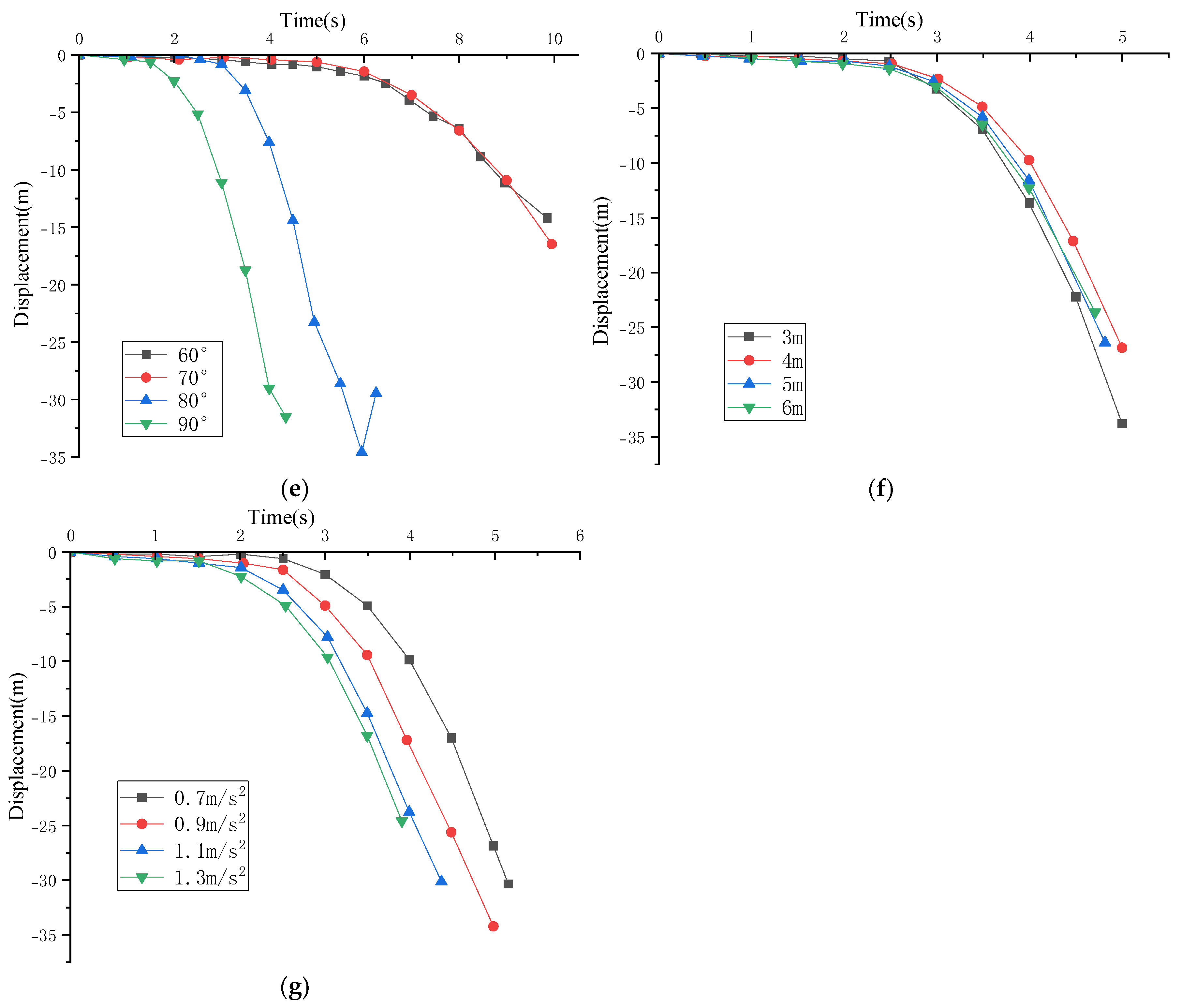 - Seismic amplitude and slope angle significantly affect collapse initiation. Quantitative result: Seismic amplitude showed a positive correlation with collapse time, while slope angle exhibited a negative correlation until β ≈ 70°. Interpretation: Higher PGA delays collapse by prolonging the rocking phase, whereas steeper slopes accelerate it. Engineering implication: Slope angle reduction or seismic retrofitting may be effective in high-seismicity regions.