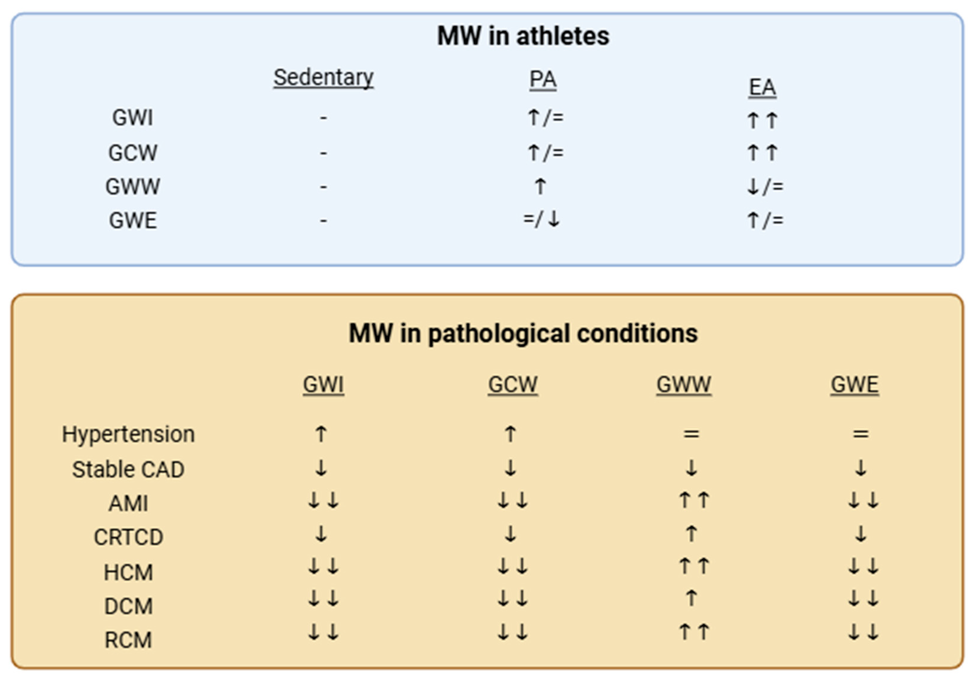 | Correlation with CPET | Weak correlation between GLS and CPET-derived VO2/kg due to load dependence. | Moderate correlations between MW indices and CPET-derived VO2/kg in both semi-recumbent ergometer and treadmill protocols. |