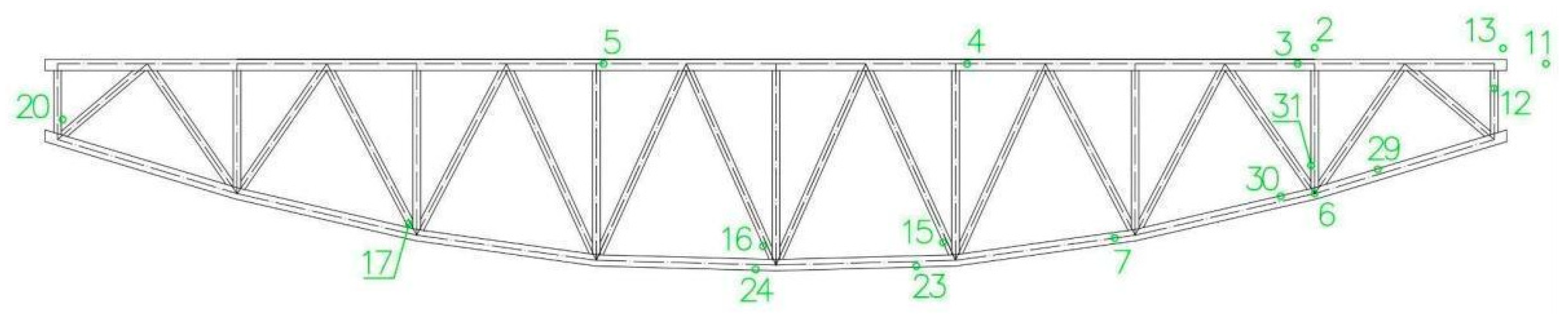 The main stage of the survey focused on the detailed measurement of characteristic points on the bridge structure. From two independent total station positions, the spatial coordinates of all significant and easily identifiable elements were recorded, facilitating their subsequent recognition and marking in the photographs. These elements included riveted heads, joints between structural elements, truss nodes, and pre-attached photogrammetric targets. The targets were printed on A4 sheets and fixed in accessible locations. This approach enabled precise measurement of the targets and their accurate identification in photogrammetry software such as Bentley ContextCapture 24.1.6.2180 [39] and Agisoft Metashape 2.1.2 [39]. Each point’s spatial position was recorded multiple times to allow for accuracy verification and error elimination arising from minor misalignment of the total station’s crosshairs. In total, 41 points were measured and assigned coordinates in the PL-2000 horizontal coordinate system and PL-EVRF2007-NH vertical reference system. These points were labeled from 1 to 41 and were instrumental in orienting all photographs within 3D space.