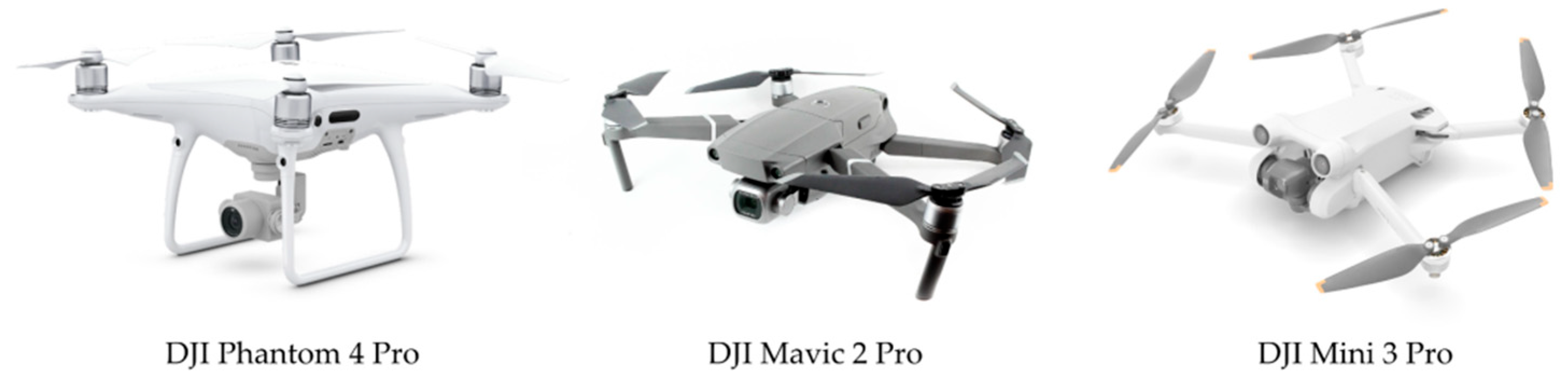 Figure 12. Examples of DJI drones used in photogrammetry: the DJI Phantom 4 Pro, DJI Mavic 2 Pro, and DJI Mini 3 Pro (photos from the DJI official website).