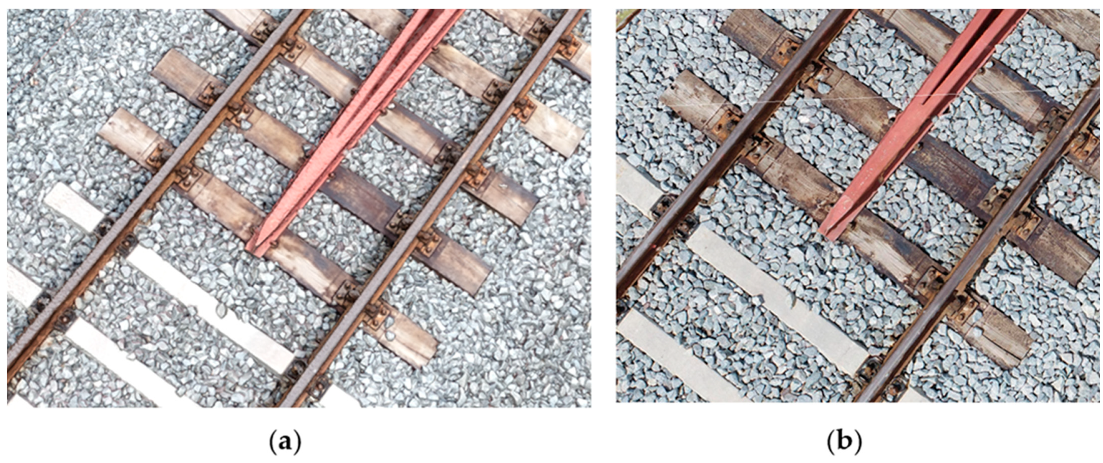 Figure 26. Detailed views on the 3D model of the railway structure texture: (a) generated in Agisoft Metashape; (b) generated in Bentley ContextCapture.