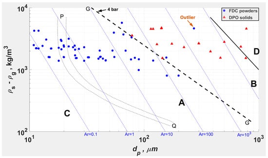 FDC is the dense conveying mode of fine powders [] that are easily aeratable but deaerate slowly, typically Geldart C and A [], with the Geldart A-B boundary at 4 bar per Grace [] as a reasonable upper bound (Figure 1) []. The overlap of FDC and Dilute Phase Only (DPO) solids at the A-B boundary is largely attributed to the chart accounting only for the particle size () and not for the Particle Size Distribution (PSD) []; outlier FDC powders at high Archimedes numbers () are probably due to stronger mechanisms of cohesion []. Recall that the scope of this article is limited to SCA powders (Hausner Ratio < 1.25) and excludes Geldart C behavior; SCA powders can be slightly cohesive due to the ubiquitous van der Waals forces (), but powder-specific mechanisms such as liquid bridges and electrostatic and magnetic forces are excluded too.