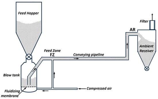 An example of an FDC system is included in Figure 2 []. The blow tank is essentially a fluidized bed feeder that enables high solids flux (1000 3000 kg/m2s) and loading (150 300). The Feed Zone (FZ) is typically at ~4 bar with superficial gas velocity () ~ 3 m/s; as the air expands along the conveying pipeline to the Ambient Receiver (AR), increases and the solids volume fraction () decreases. Conveying pipelines are typically predominantly horizontal with some vertical upflow legs.