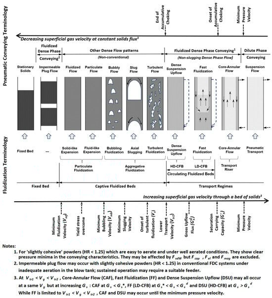 Flow patterns of vertical upflow for SCA powders are shown in Figure 3 [,,,,,,,,,,,,]. Flow in the vertical upflow legs of FDC is referred to as ‘Non-Slugging dense phase Flow’ (NSF) [], comprising DSU, FF, and CAF. Flow patterns in Figure 3 are further discussed below, together with the PMW.