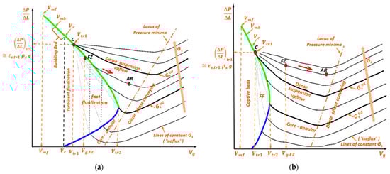 The phase map of Wirth adapted to FDC of SCA powders, reproduced from Figure 5-2 of []: (a) Shows that FDC of coarser SCA powders occurs under FF and/or DSU, with ; (b) Shows that FDC of finer SCA powders occurs predominantly under DSU, with . Shown in green is the locus of the bottom dense zone (locus of ) and in blue, the locus of the top lean zone (locus of ); is the end of accumulative choking; the hazy lines that traverse FF towards show the progression of the isofluxes with decreasing , based on the average over the entire riser.