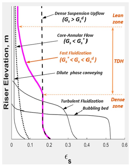 Regarding the transport regime: once past , the entire column of powder starts to flow (although the solids velocity at the bottom can be significantly lower than that at the top), requiring recirculation of solids to maintain the inventory. The relation between and is now dependent on : high leads to DSU (corresponds to HD-CFB, as defined in our work) and low to FF (corresponds to Low Density Circulating Fluidized Bed, LD-CFB). FF is characterized by an S-Shaped axial Profile (SSP), with a dense zone at the bottom, a lean zone at the top, and Transport Disengagement Height (TDH) in between [,] (Figure 5); DSU is characterized by gross upflow of solids with little backmixing. At , DSU, FF, and CAF may all occur at a same but at decreasing (Figure 3): DSU at greater than the gross upflow flux (), CAF at less than the saturation carrying capacity (), and FF in between at . CAF consists of at least some downflow in the denser annulus, with net upflow overall; at the transition to FF at , the denser annulus turns to net downflow and the solids start to form a dense zone at the bottom, with CAF continuing on the top of it. With further increase in , the bottom dense zone grows to occupy the entire riser at at the transition to DSU [,]. The locus of the minimum pressure velocity () is broadly accepted as the dense–dilute transition at lower (typically at 0.02) [,].