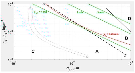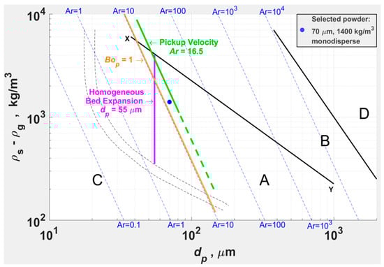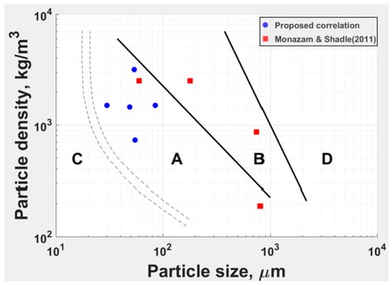 , and corresponding to the A-B boundary at ambient conditions. Reproduced from []. per Haider and Levenspiel [], per Bi et al. [], and per (1).