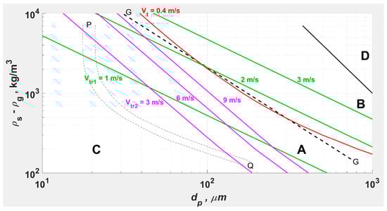 Geldart chart adapted to FDC, with lines of constant superimposed. Conveying modes data from [,,,,,,,]. G-G is the A-B boundary at 4 bar per Grace [].
