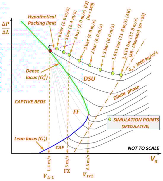 Key differences between the version of PMW proposed by Wirth [] and that adapted to SCA powders in Figure 4 include the following: (a) locus of the top lean zone (i.e., entrainment), due to clustering of particles, only starts at (at a low multiple of based on the mean particle size) rather than at [,]; (b) lines of constant (‘isoflux’) converge at (, ) (‘end of accumulative choking’, as defined in our work), wherein entrainment has virtually stopped and the particles have collapsed into a turbulent bed, to follow the essentially unique locus within the captive beds [], rather than directly at ; and (c) experimental data of Wang et al. [] suggests that, with decreasing , the isofluxes at may not sustain DSU but may slip into and traverse within FF towards , as the bed gets denser overall.