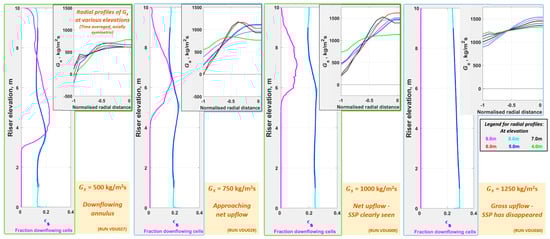 Figure 14 shows that the flow in the annular region (which starts as gross upflow within the dilute phase) transitions to net upflow within CAF to net downflow at the transition to FF, but reverts within FF to net upflow with increasing and finally to gross upflow at the transition to DSU. Note that the transition from CAF to FF was only observed at = 300 kg/m2s, as against the speculative simulation points in Figure 10.