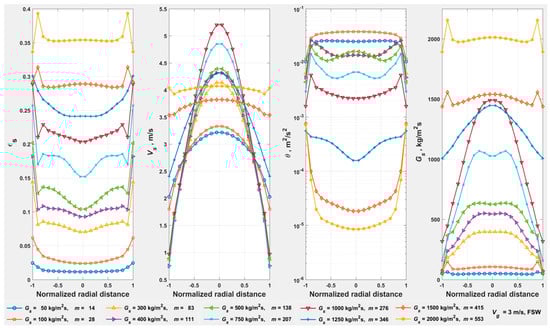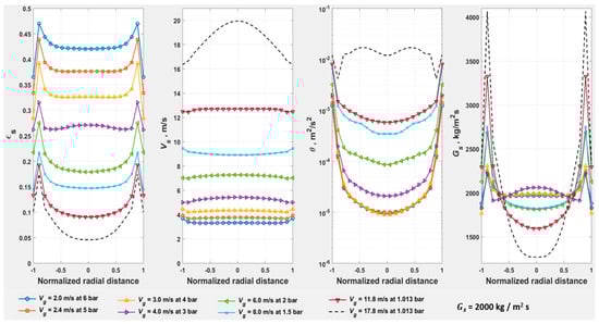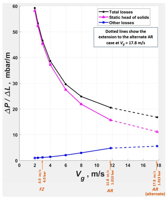 The trend in in Figure 15, from the FZ at = 3 m/s towards the AR at = 11.8 m/s, indicates that the pressure minimum is not attained at the AR for the conditions simulated. The pressure minimum is probably not attained at the alternate AR at = 17.8 m/s either, with the static head of solids still the major component. However, a change in the flow regime towards the dilute phase can be perceived in the radial profiles in Figure 16 at = 17.8 m/s, with attaining a clear parabolic profile, and more significantly, reverting towards . This reversal in clearly preserves DSU as a transport regime at , with at or at , and with (Figure 4, Table 2).