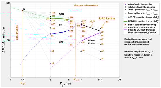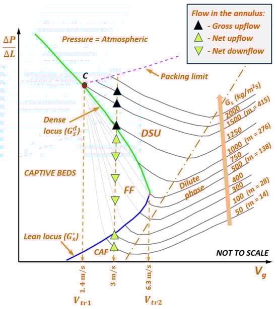 Kim et al. [] proposed an alternate criterion for the transition from FF to DSU: the at which the net upflow of solids is achieved in the annulus. Experimental data, for example [,] show that this transition happens at a fraction of , when SSP is still conspicuous and backmixing is substantial. Therefore, this criterion may lack practical relevance, and DSU might not be classifiable as a distinct flow regime based on flow field behavior. Furthermore, it may not be possible to distinguish between CAF and DSU using this criterion, either.