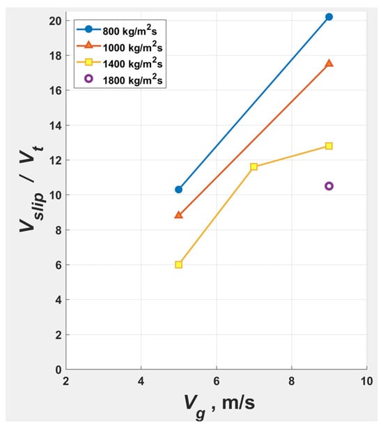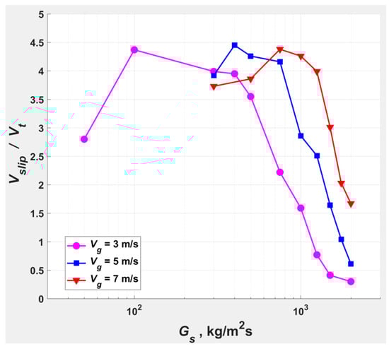 Yerushalmi and Cankurt [] observed the slip velocity () (2) to be a low multiple of at the transition to transport regimes at , to increase within FF to peak at ~20, and to drop thereafter within the CAF (‘transport riser’) to attain essentially as the particles approach unhindered flow conditions at the dilute phase.