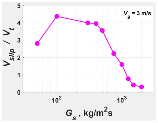 The results in Figure 12 validated that the transition from FF to DSU, defined as the disappearance of SSP, occurs at . SSP persists in the axial profile with a net upflow of solids at = 1000 kg/m2s and only disappears with gross upflow at = 1250 kg/m2s ; gross upflow is maintained at (Figure 10) as well as in the VPND runs at = 2000 kg/m2s (Figure 11). Therefore, the backmixing near the wall at lower elevations, observed by Wang et al. [] at = 1800 kg/m2s and = 9 m/s, was probably due to solids entering the riser bottom at a lower velocity, although from a fluidized bed feeder, which requires acceleration. The fraction of downflowing cells was used in lieu of the fraction of downflowing particles, as only the averages over the cells are available in Eulerian modeling.