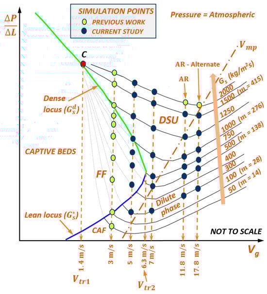 Resolved phase maps are a means for a priori prediction of flow regimes from powder characteristics, enabling the selection of robust operating envelopes and facilitating numerical modeling. The regimes of vertical upflow in straight pipes of uniform circular cross-section under gas–solids two-phase flow for Slightly Cohesive Geldart A (SCA) powders (Hausner Ratio < 1.25) [,] are well resolved by fluidization research at lower solids mass flux ( 500 kg/m2s). However, high operations such as Fluidized Dense phase Conveying (FDC), typically 1000 3000 kg/m2s [], are uncommon, and there are knowledge gaps. Specifically, Dense Suspension Upflow (DSU) as a separate flow regime and its boundaries with Fast Fluidization (FF) and Core-Annular Flow (CAF) are not broadly accepted [,]; while the locus of the pressure minimum is broadly accepted as the dense–dilute transition at low [,], its suitability at high requires validation, too.