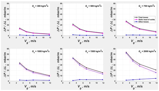 The trend in for the VPND runs (Figure 15), from the FZ at = 3 m/s towards the dense limit at = 2 m/s, indicated that the isofluxes at high also converge towards (, ) rather than diverging towards the hypothetical packing limit. This is because the static head of solids becomes increasingly dominant towards the dense limit, with the viscous losses diminishing and the frictional losses remaining insignificant at 0.5 (Figure 16), the threshold for frictional losses ().