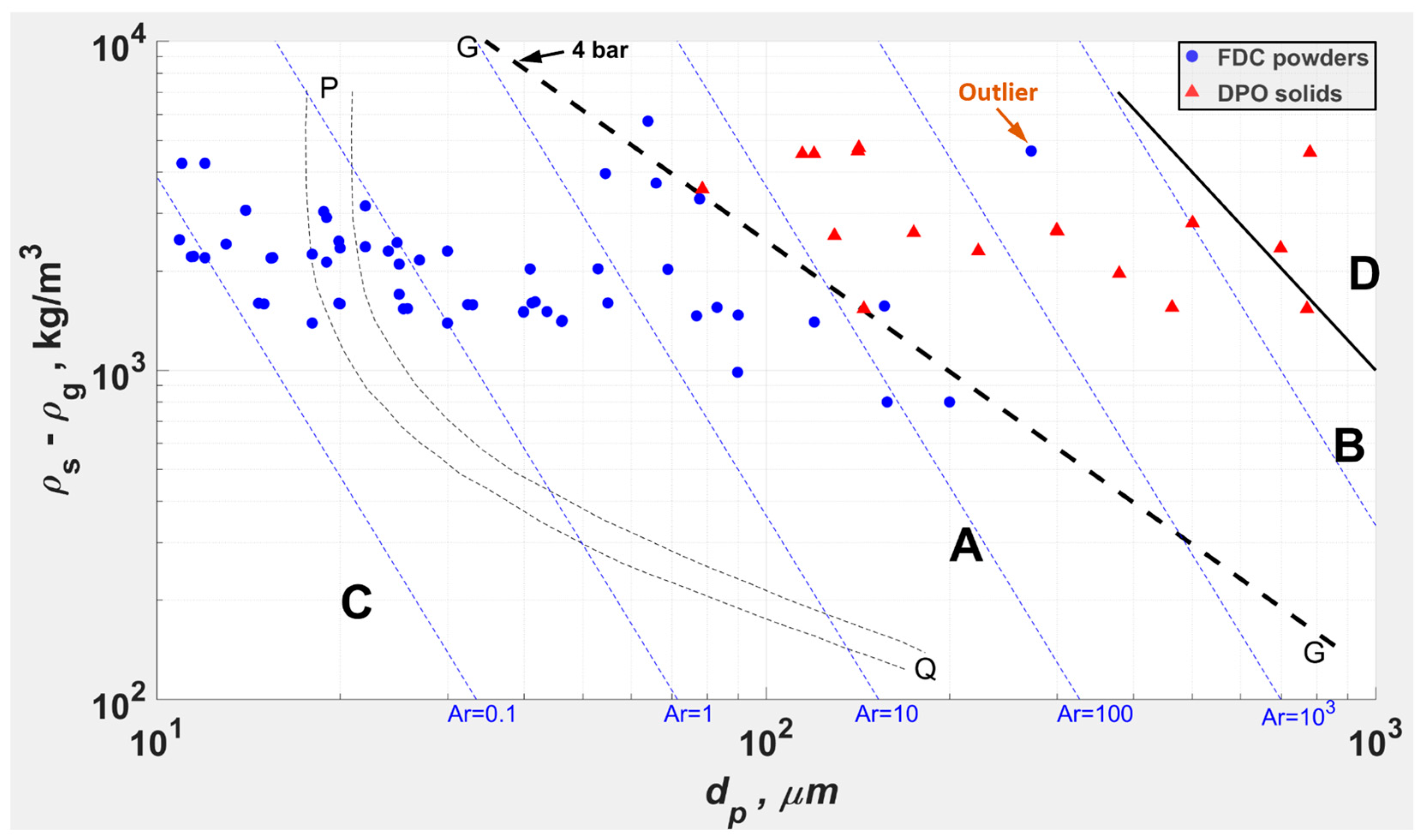 - Geldart A powders close to the A-B boundary may tend to Geldart B unless they are wide in PSD, including significant [3,71]. As it was opted to model a monodisperse powder with dominant gravity over , the powder had to be low in and to be sufficiently away from the A-B boundary and to clearly classify as Geldart A.
