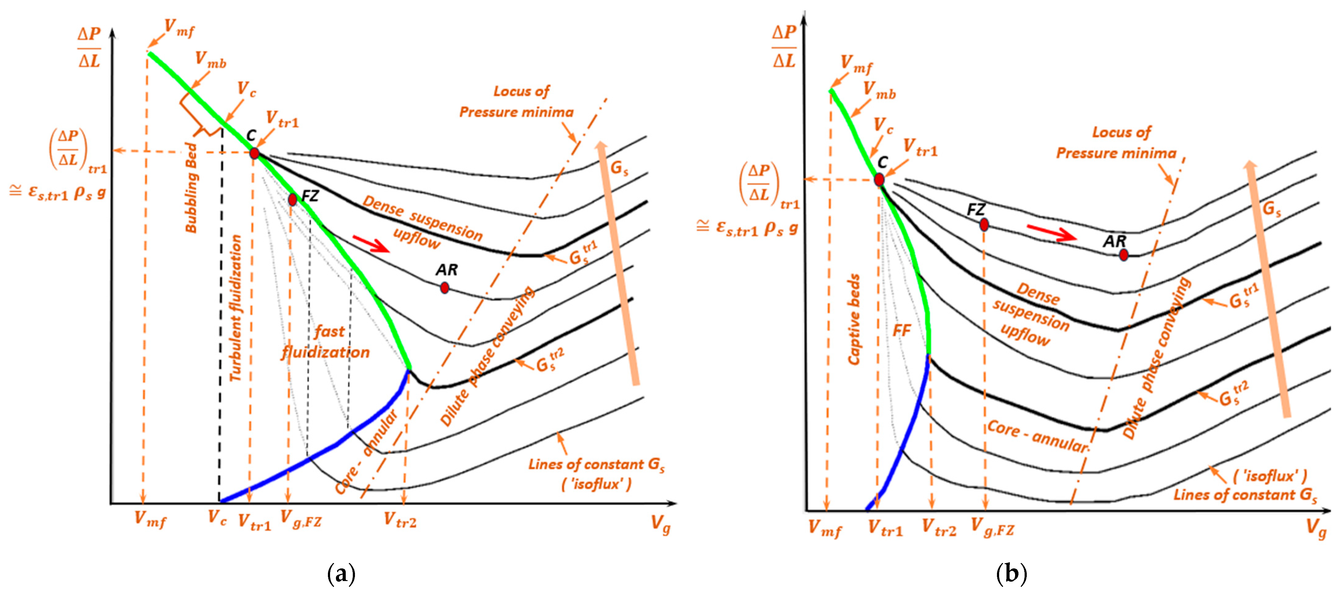 - Bi, H.T.; Grace, J.R. Flow Patterns in High-Velocity Fluidized Beds and Pneumatic Conveying. Can. J. Chem. Eng. 1999, 77, 223–230. [Google Scholar] [CrossRef]