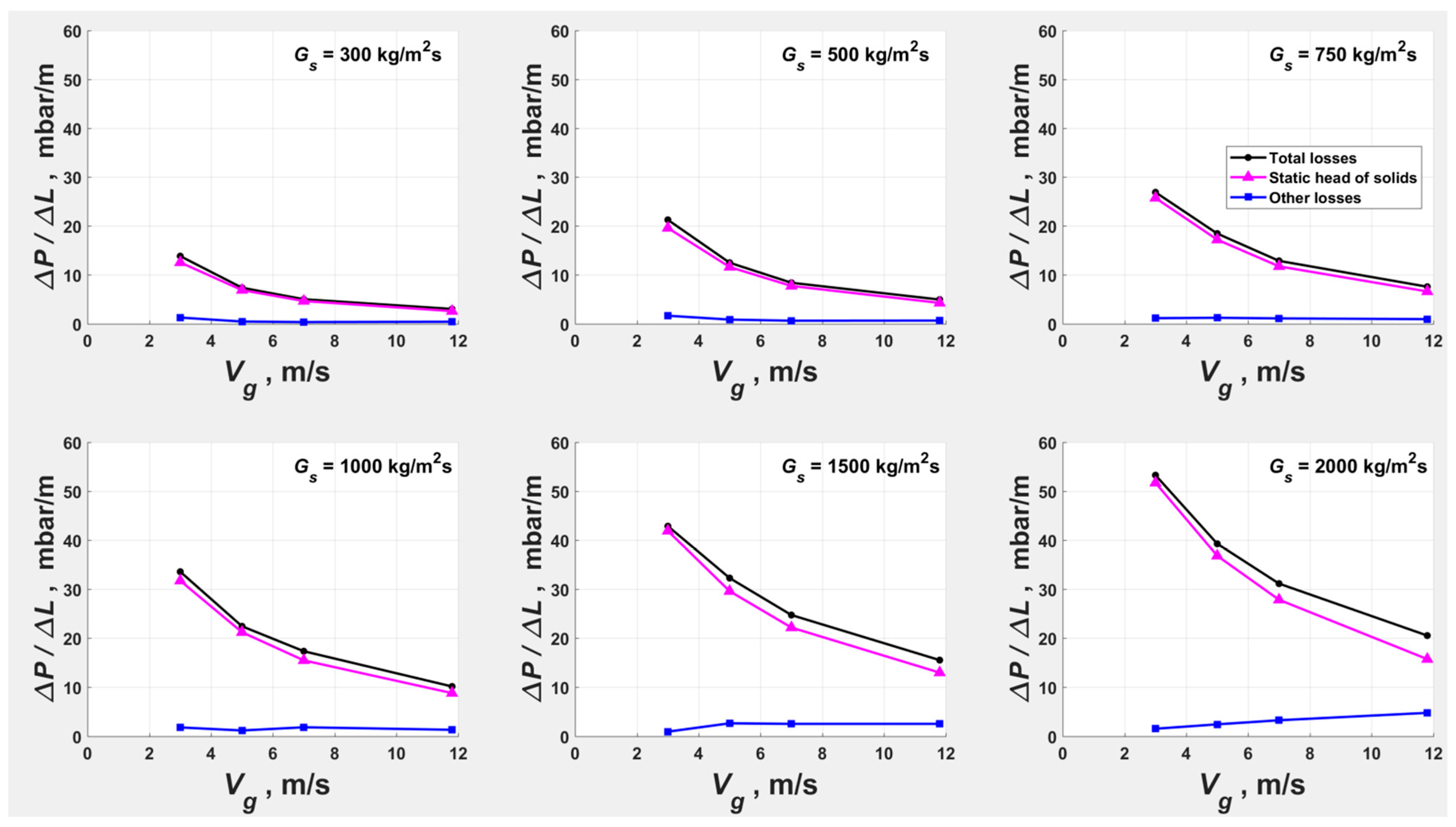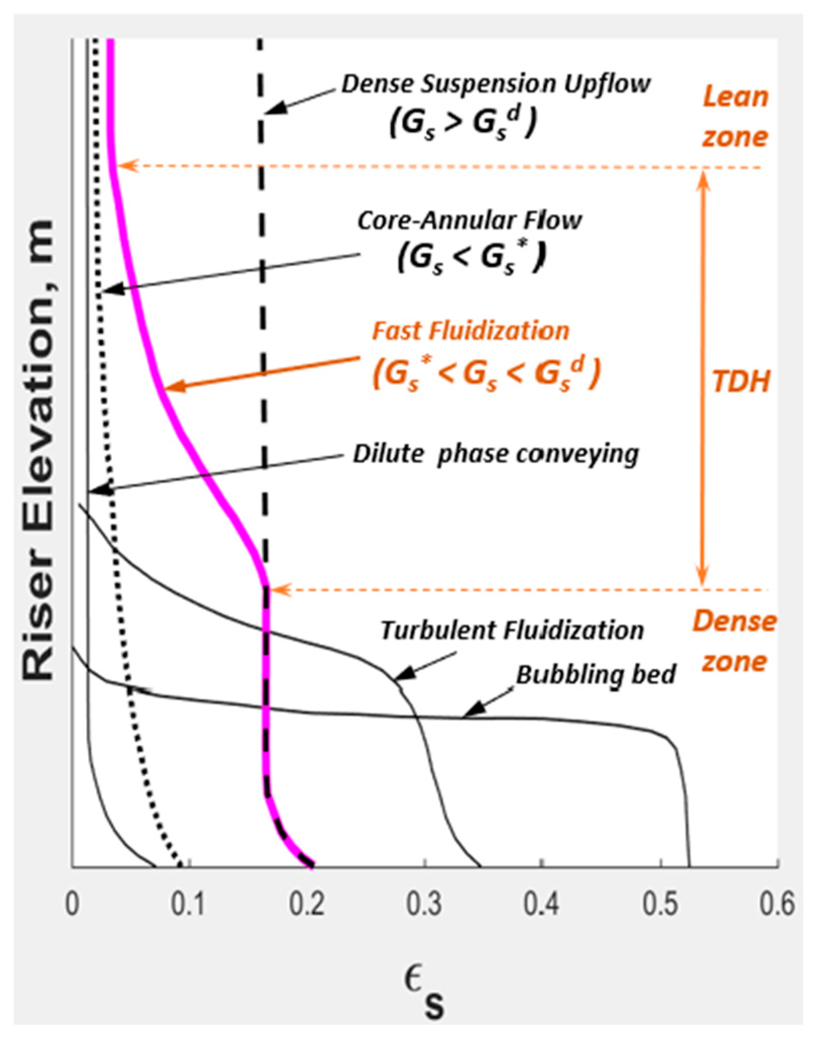 - The phase map in Figure 4 considers the criterion of Li and Kwauk [14] (based on vertical upflow experiments in straight pipes of uniform circular cross-section), which is the disappearance of SSP, for the transition from FF to DSU. The experiment of Wang et al. [16] suggests that, at , SSP most probably disappears at , when the riser attains gross upflow with little backmixing. However, there is some uncertainty in the axial profiles reported in [16] that needed clarification: the riser having attained , for example, at = 1400 kg/m2s and = 9 m/s in the Figure 6(d) of [16], appeared to show backmixing at lower elevations at of 1800 kg/m2s; the backmixing was probably due to the riser being unable to sustain gross upflow with the increased feed of low-velocity solids that required acceleration.