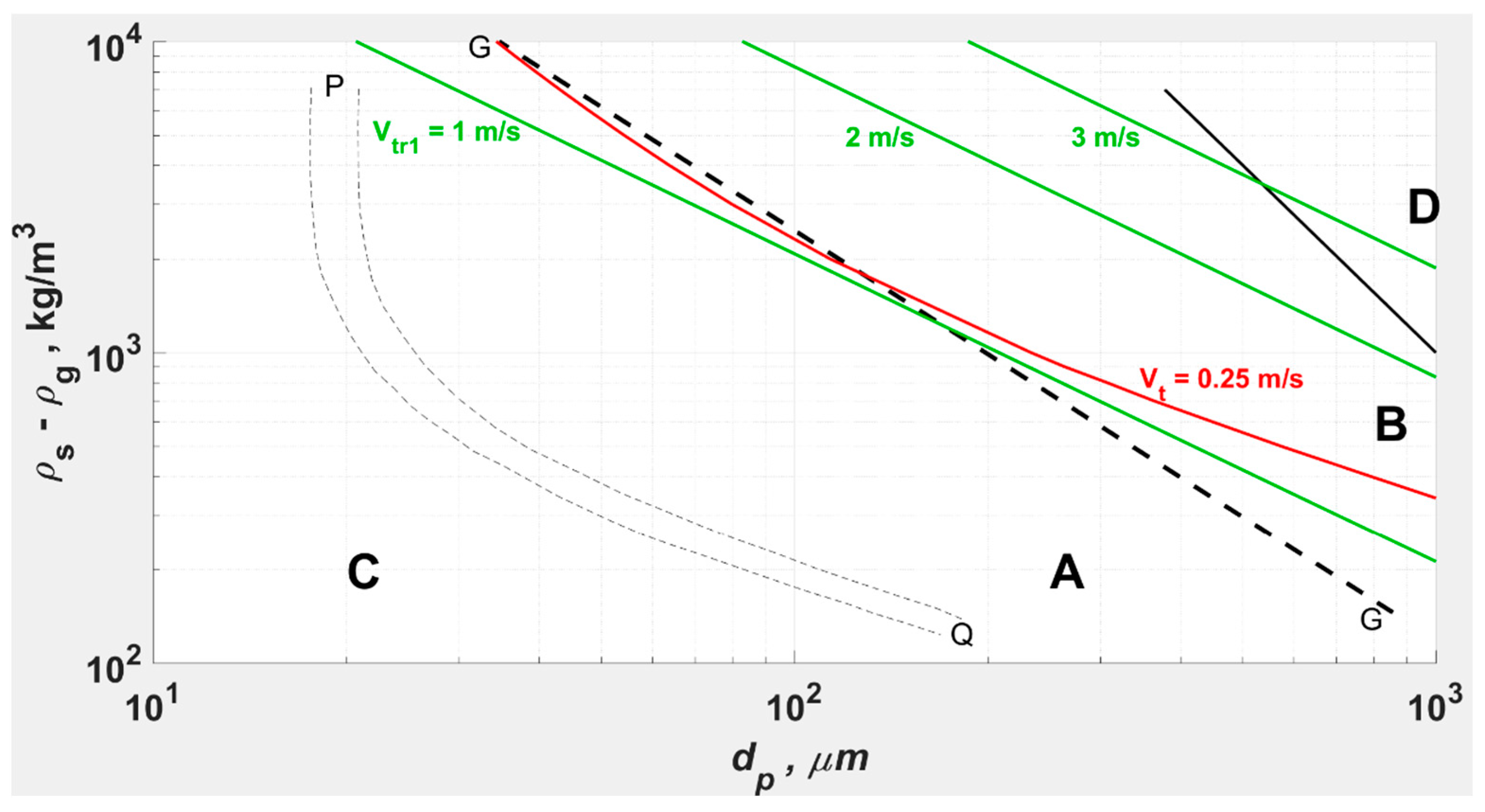 - Grace, J.R. Contacting Modes and Behaviour Classification of Gas—Solid and Other Two-Phase Suspensions. Can. J. Chem. Eng. 1986, 64, 353–363. [Google Scholar] [CrossRef]