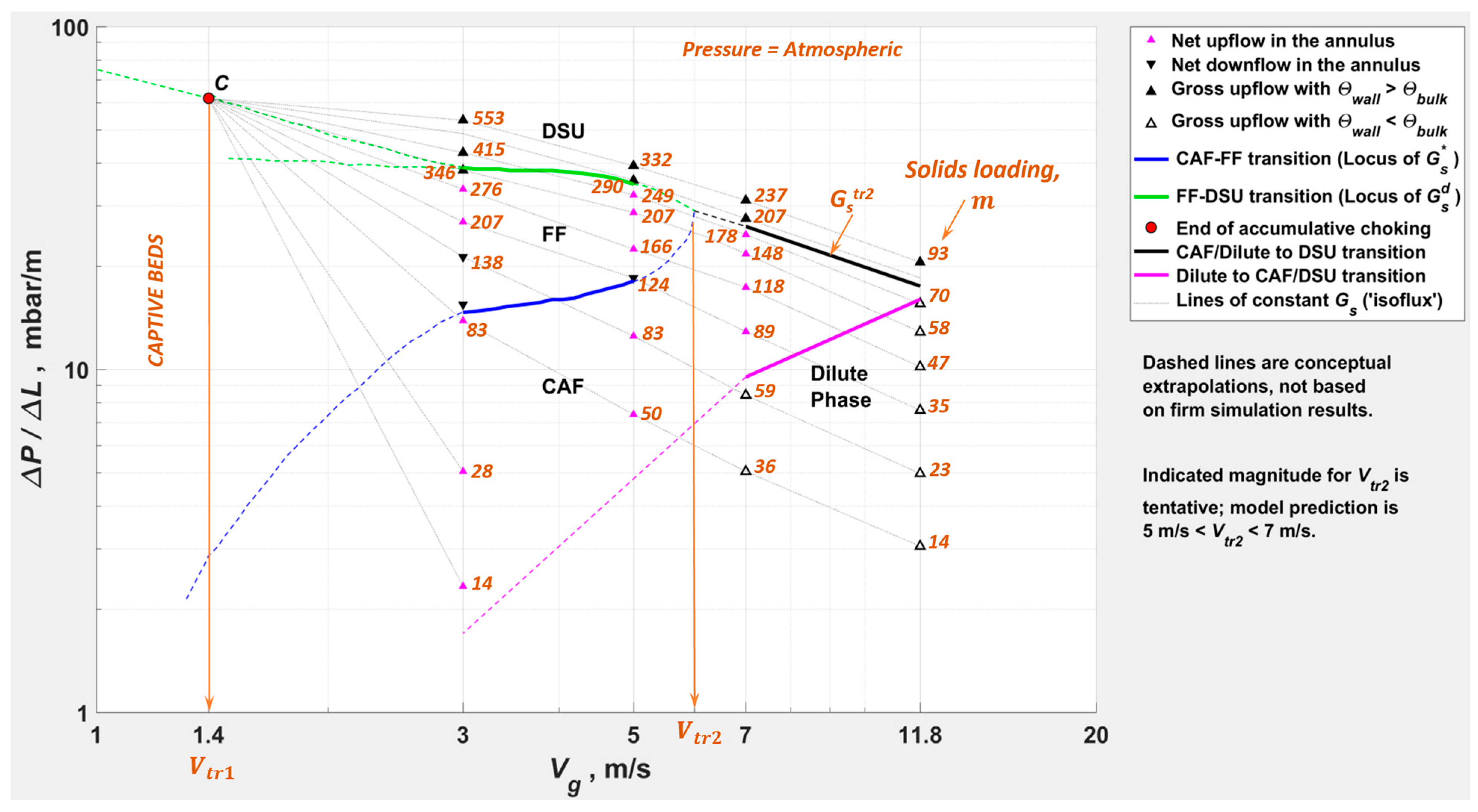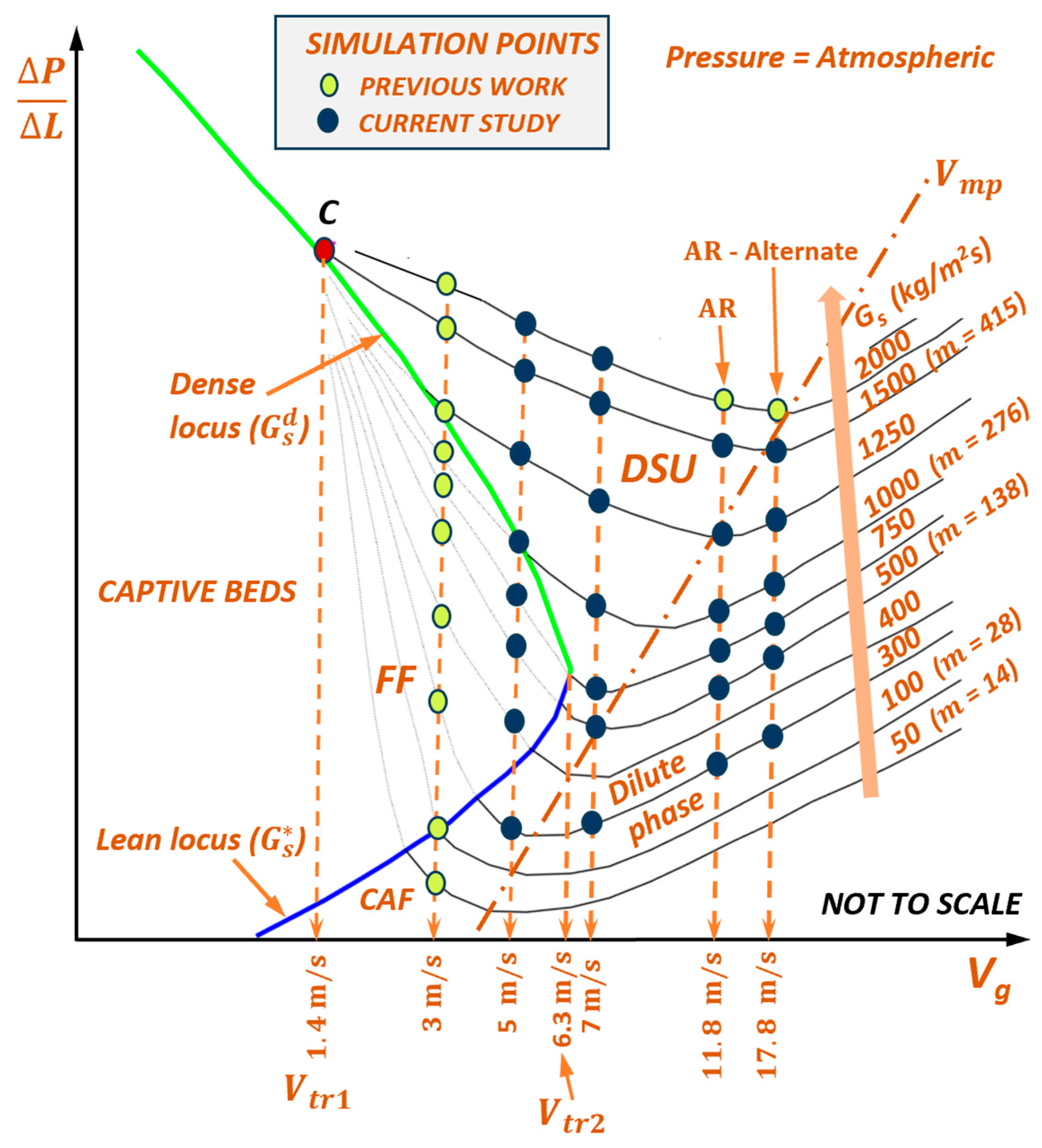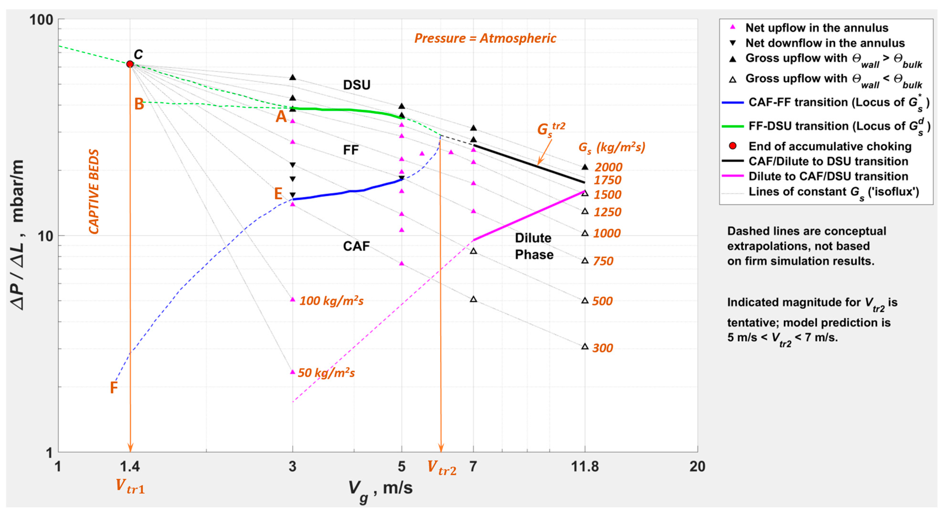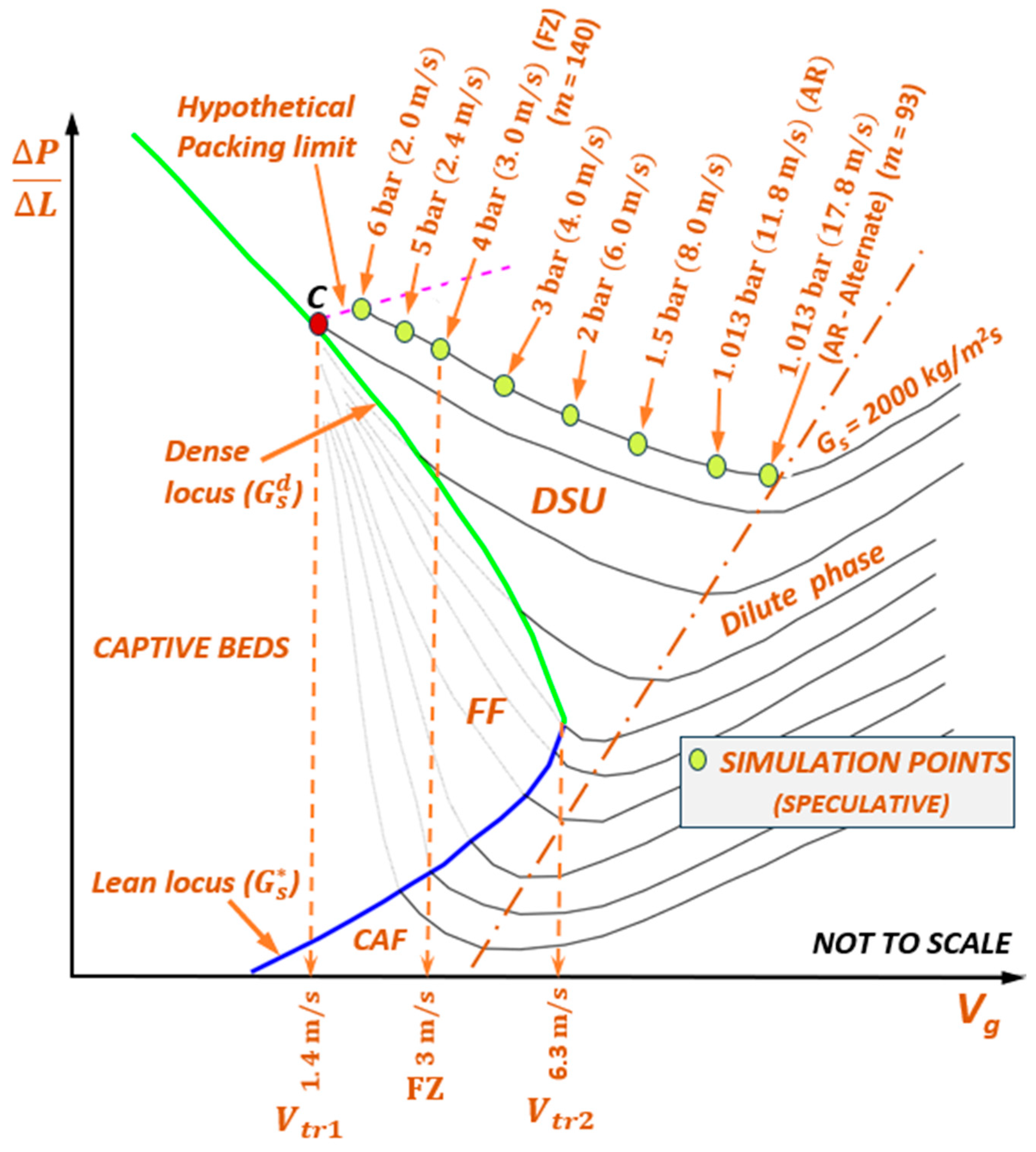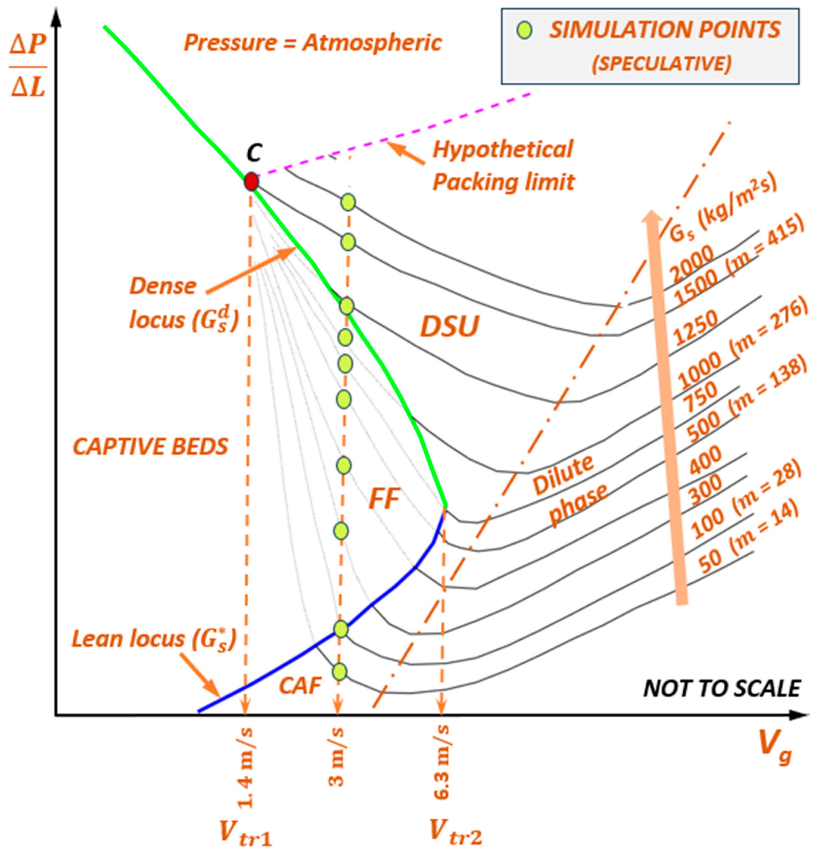 - The extent of FF at 5 m/s < < 7 m/s is not fully resolved by simulations. The indicated magnitude of (and the corresponding ) is tentative, based on conceptual extrapolation of the loci of (green), (blue), and the boundary between CAF/Dilute phase and DSU (black).