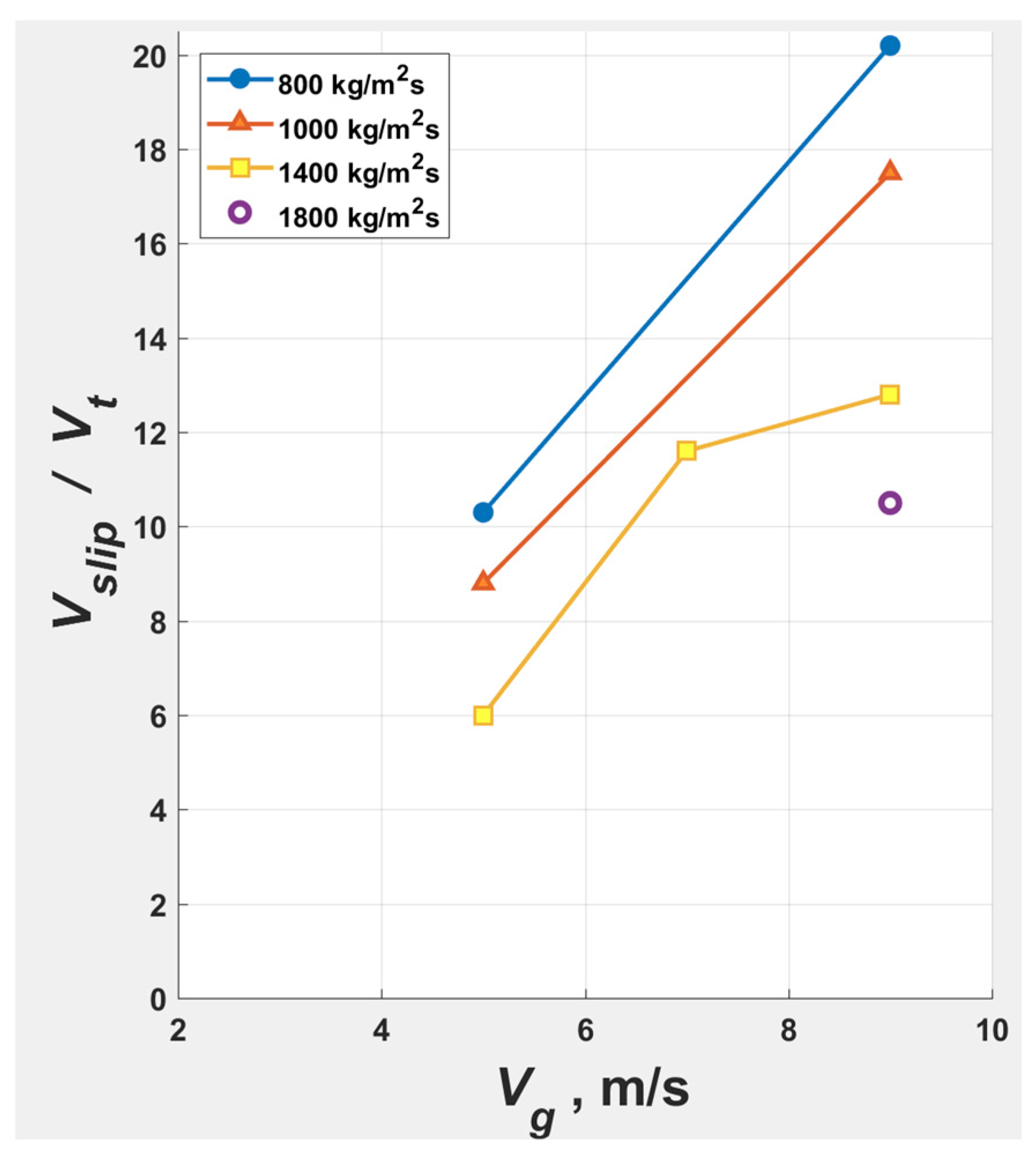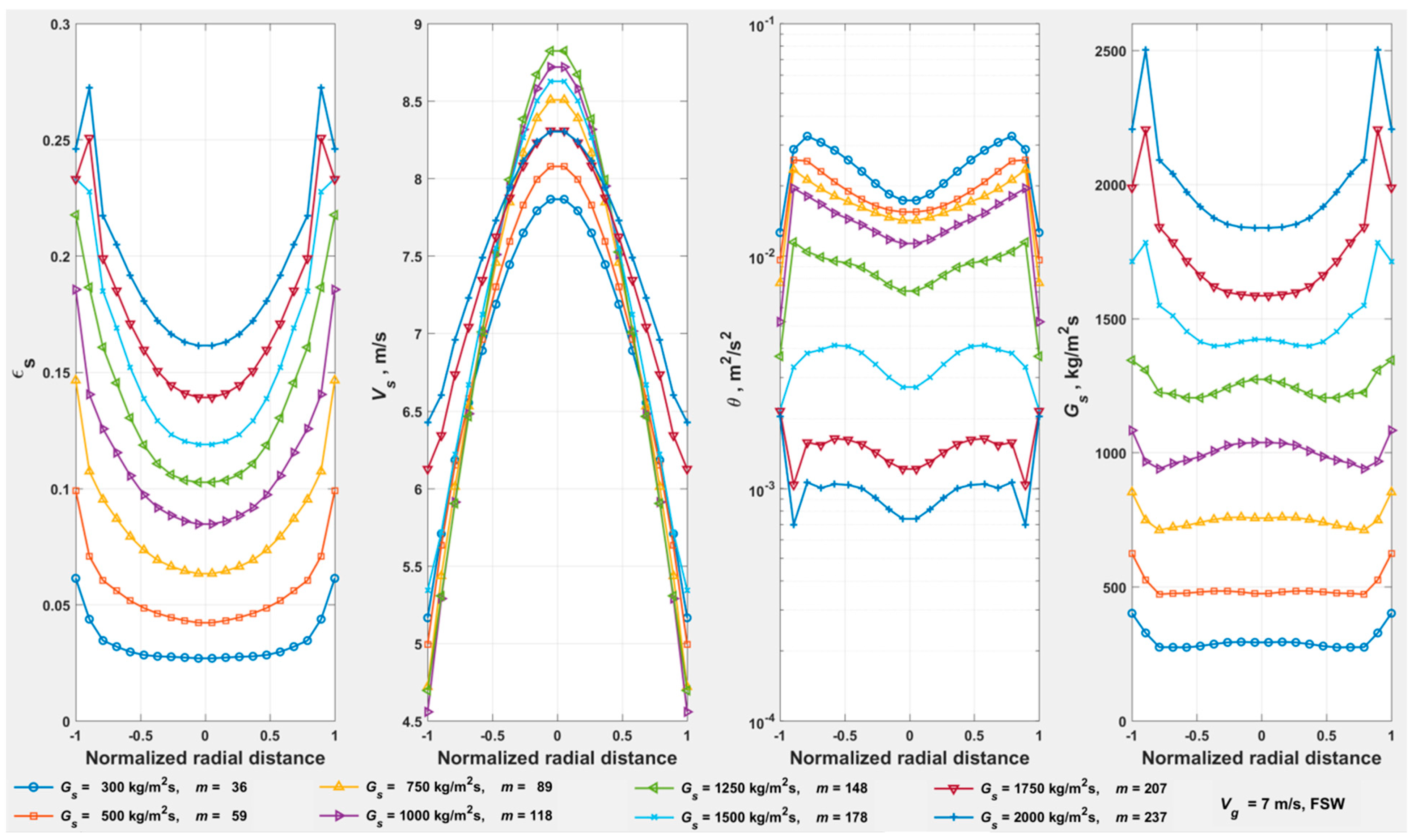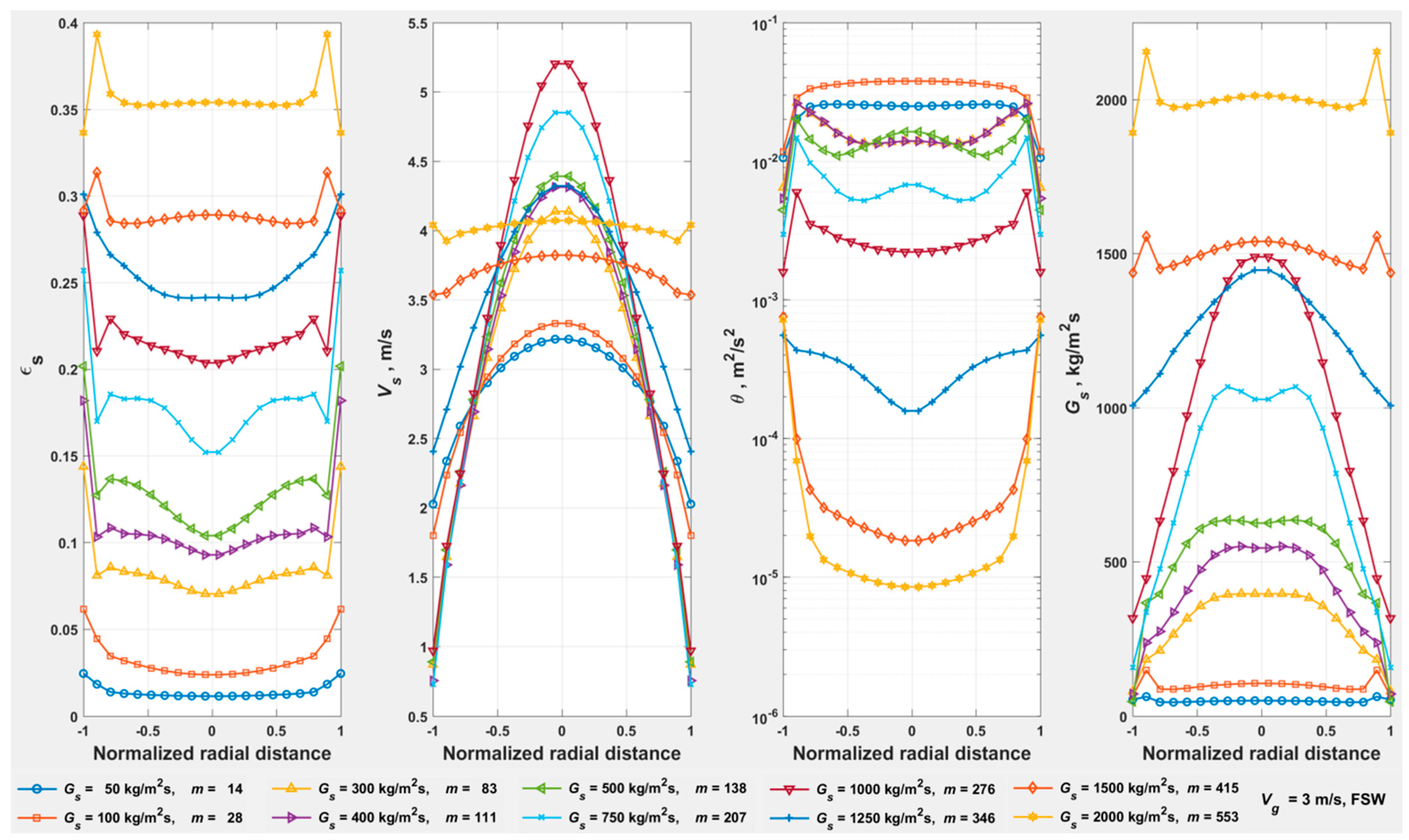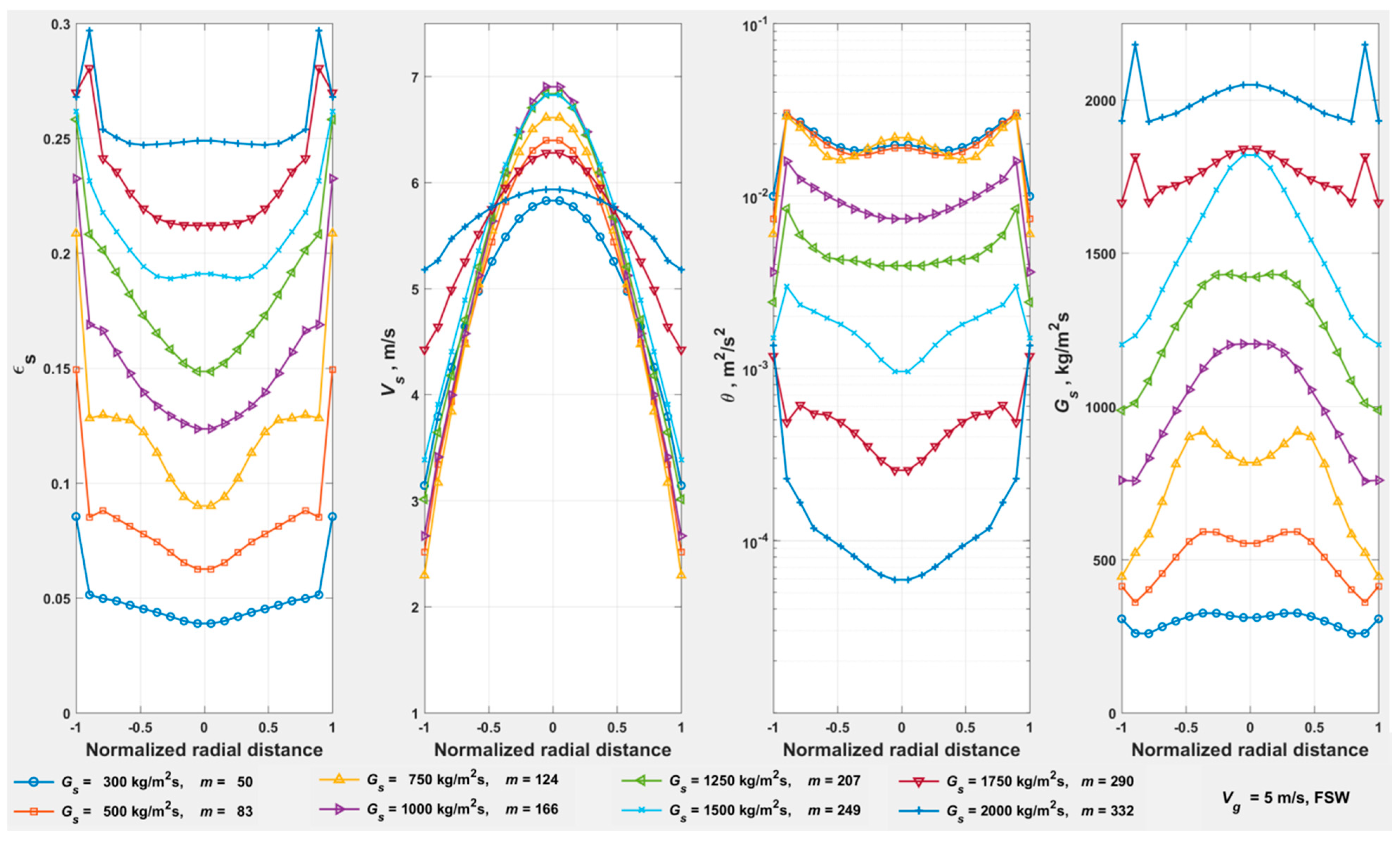 - The transition from DSU to dilute phase, perceived in Figure 16, in the radial profiles at = 17.8 m/s and of 2000 kg/m2s is also perceived at down to 1000 kg/m2s ( of 0.71) towards the top of the riser. However, the profiles at < 1000 kg/m2s are clearly spurious, with the inlet zone of flow development (in the simulation) occupying the entire = 15 m. Therefore, all the results at = 17.8 m/s are omitted in Figure 22 to avoid any uncertainty.