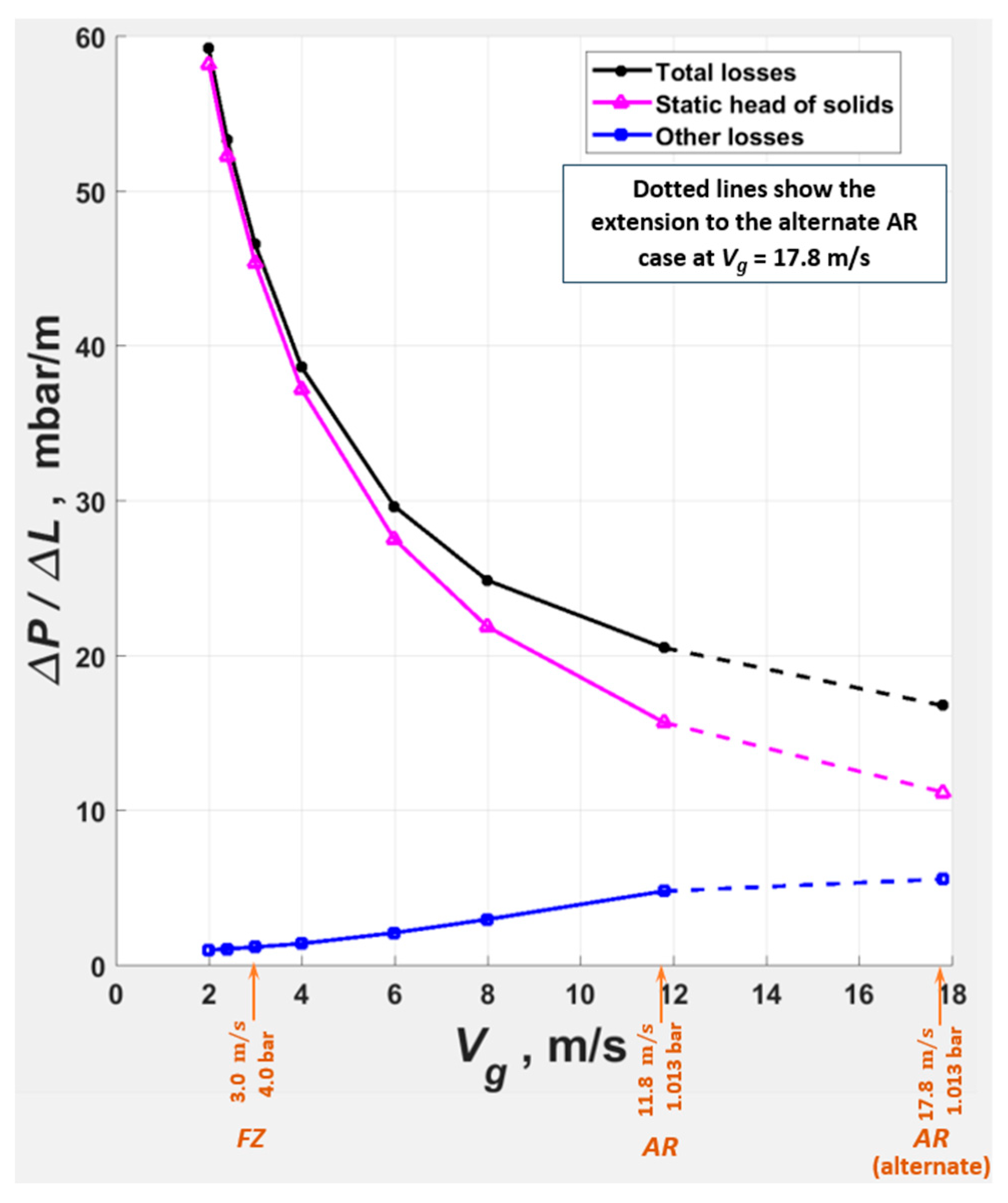 - Locus of is broadly accepted as the criterion for the dense–dilute transition at low [6,7] (wherein it is generally observed at 0.02). This criterion may be suitable at the high of DSU, too, at , considering that the static head of solids dominates at dense conditions (such as towards the FZ), and other losses take over at dilute conditions (such as near AR); however, this requires validation.